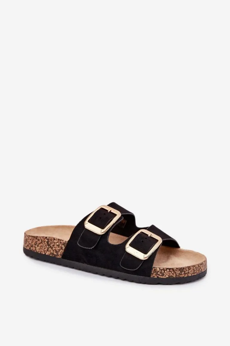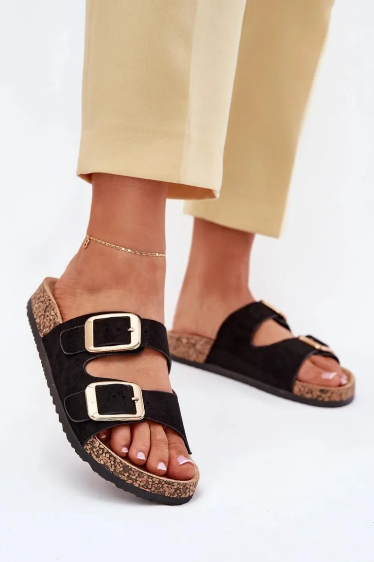 Klapki damskie z eko zamszu na korkowej podeszwie to stylowy wybór na ciepłe dni. Dwa regulowane paski ze złotymi klamrami nadają im eleganckiego charakteru, a jednocześnie zapewniają komfort i idealne dopasowanie. Doskonałe do codziennych stylizacji, łączą wygodę z modnym wyglądem, idealne na spacer czy wakacyjny wyjazd. Przy wyborze rozmiaru prosimy sugerować się tabelą rozmiarów.