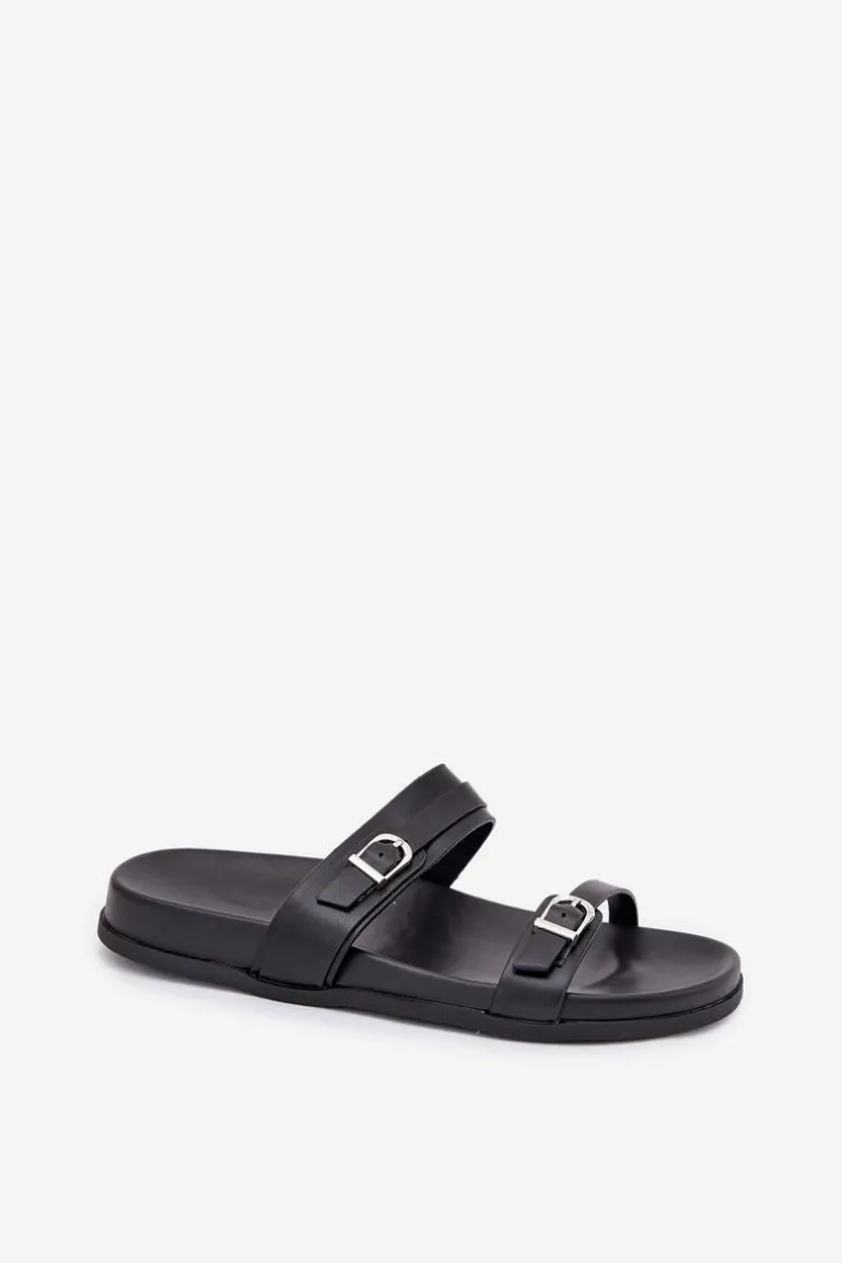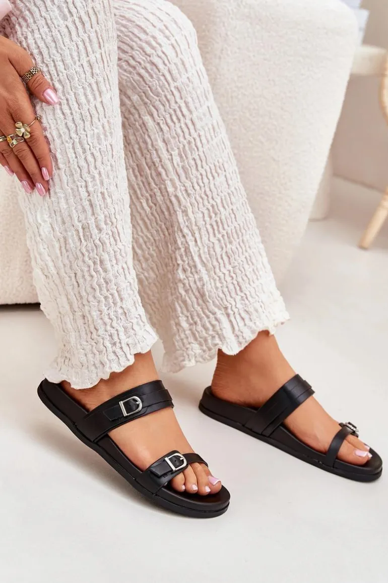 Klapki damskie z eko skóry na delikatnej platformie to stylowa i komfortowa propozycja na ciepłe dni. Model wyróżnia się dwoma paseczkami z klamrami, które dodają im nowoczesnego charakteru. Idealne do codziennych stylizacji, łączą wygodę z modnym wyglądem. Przy wyborze rozmiaru rosimy sugerować się tabelą rozmiarów.