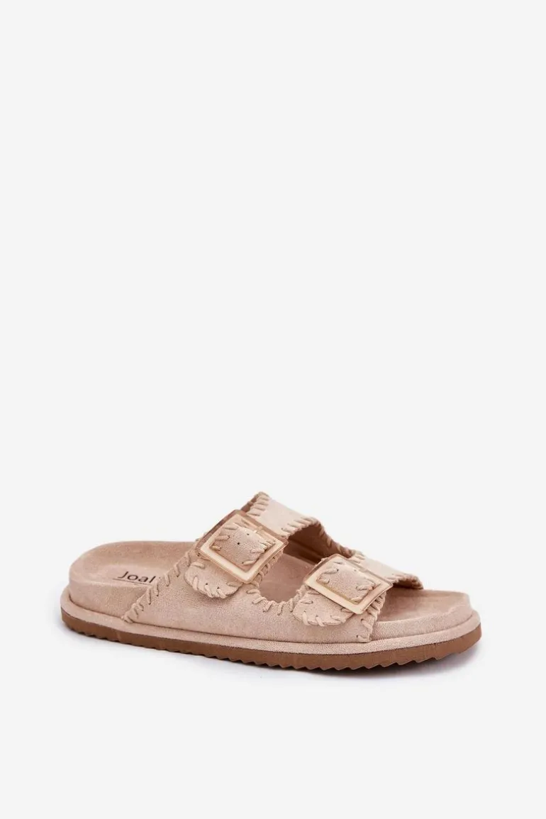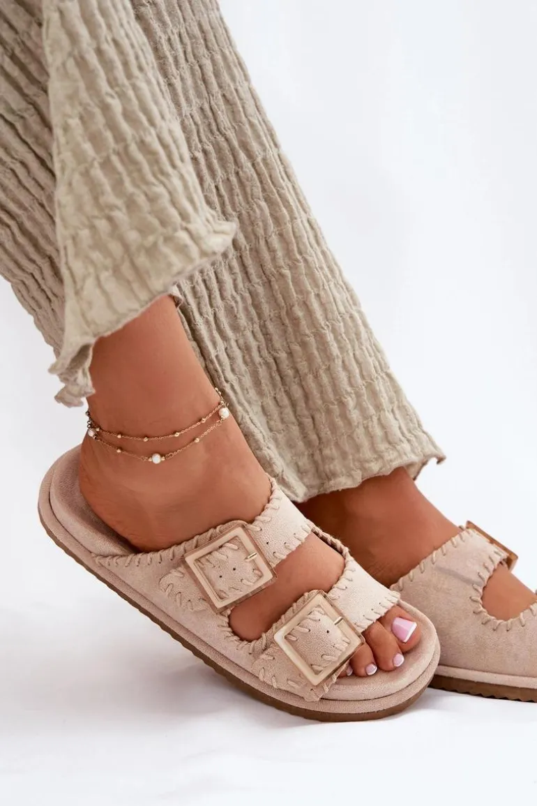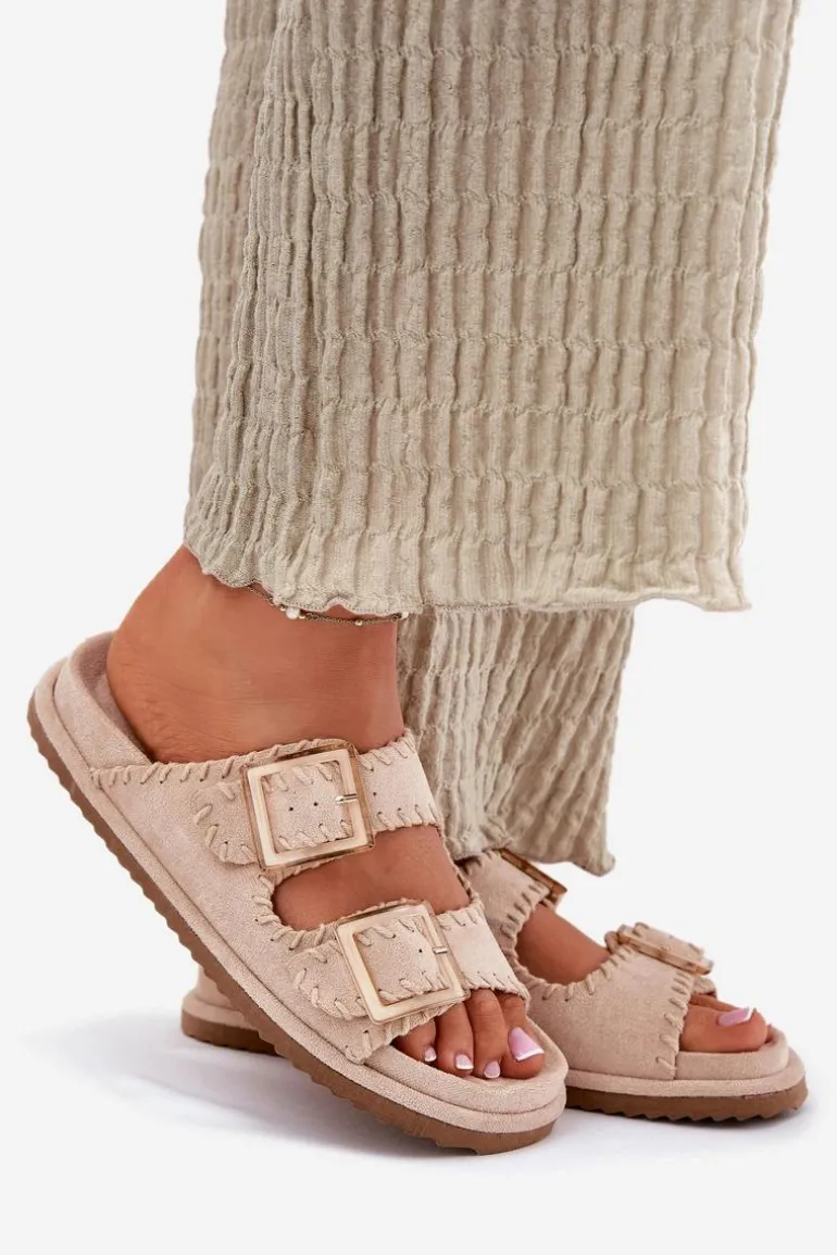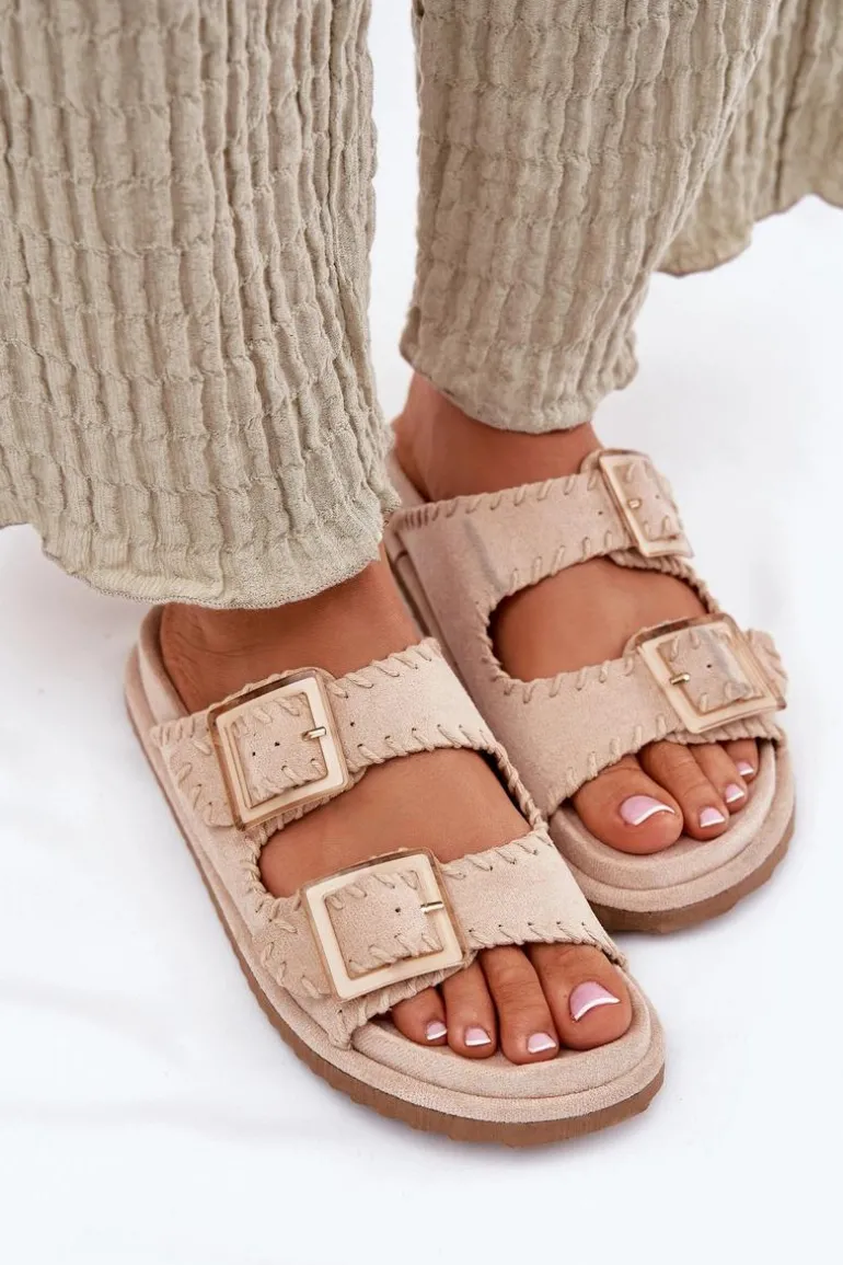 Damskie klapki z eko zamszu, które przyciągają wzrok ozdobnym obszyciem oraz efektownymi klamrami z przodu. Komfort noszenia zapewnia profilowana wkładka, która doskonale dopasowuje się do kształtu stopy. Ten modny model to świetny wybór na letnie dni – idealny zarówno do miejskich stylizacji, jak i na wakacyjne wyjazdy! Przy wyborze rozmiaru rosimy sugerować się tabelą rozmiarów.
