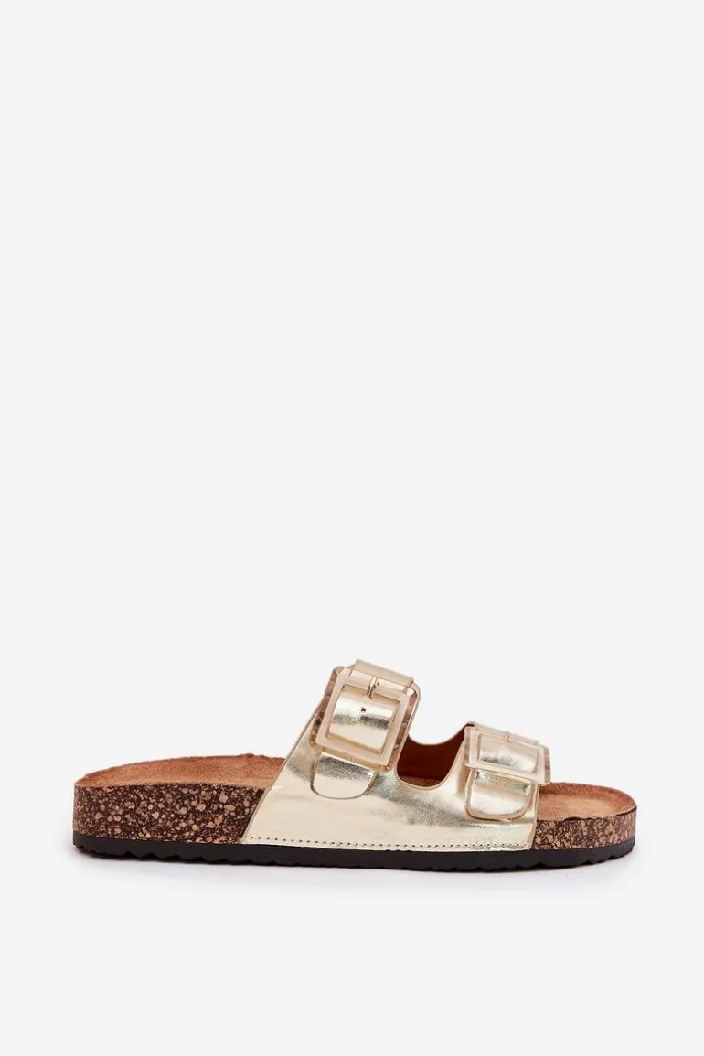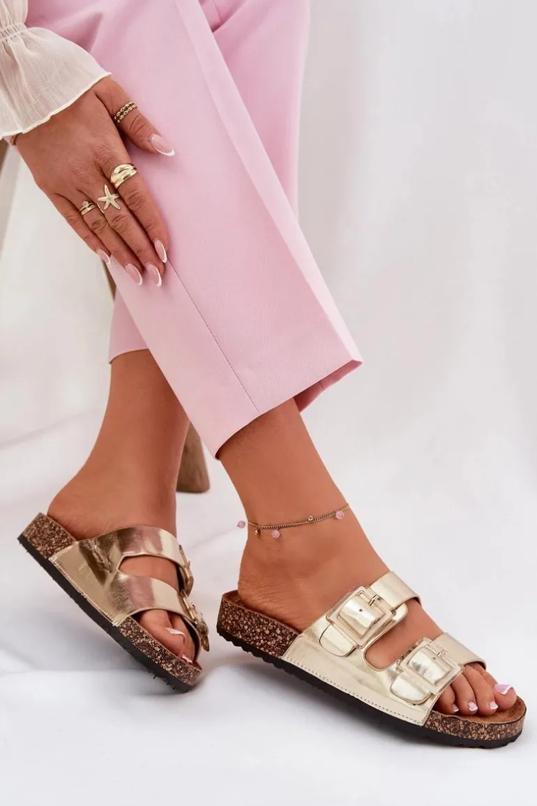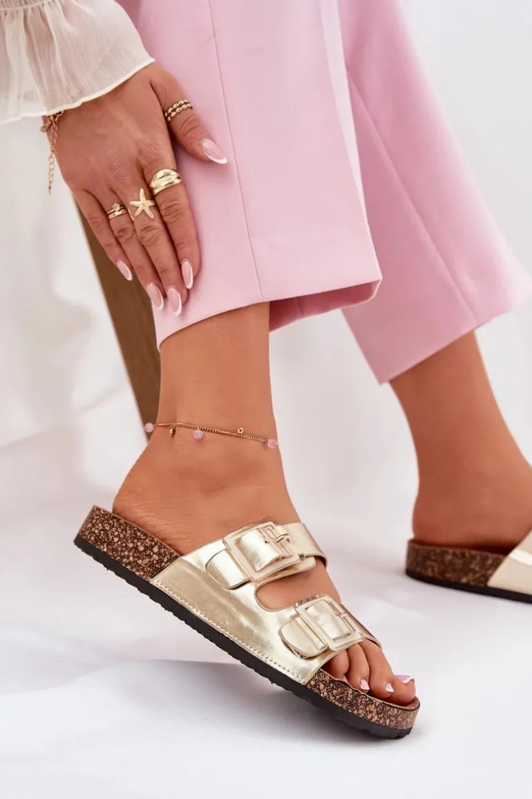 Klapki Damskie Z Klamrami Na Korkowej Podeszwie Złote Sercele