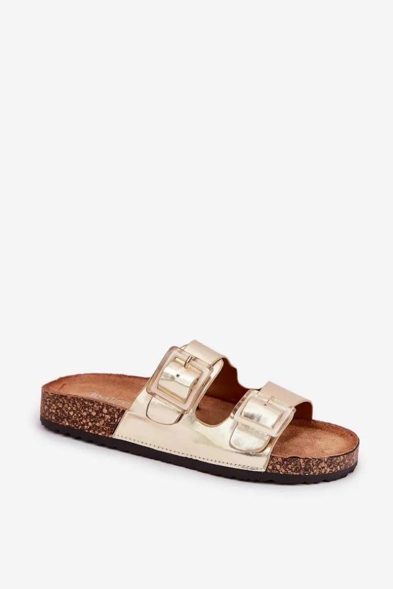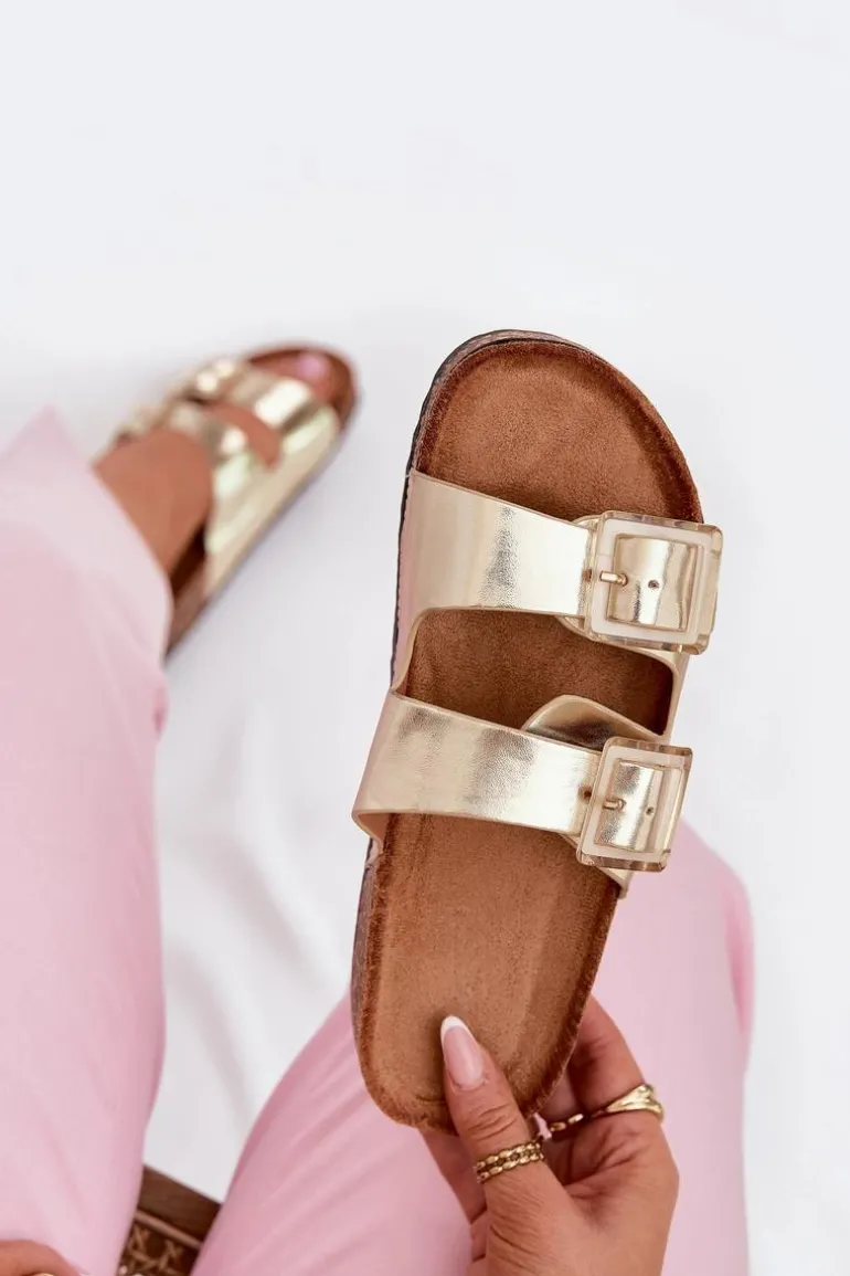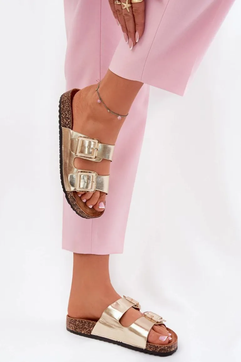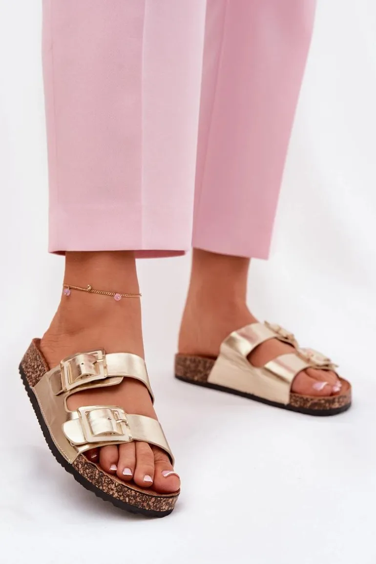 Klapki Damskie Z Klamrami Na Korkowej Podeszwie Złote Sercele