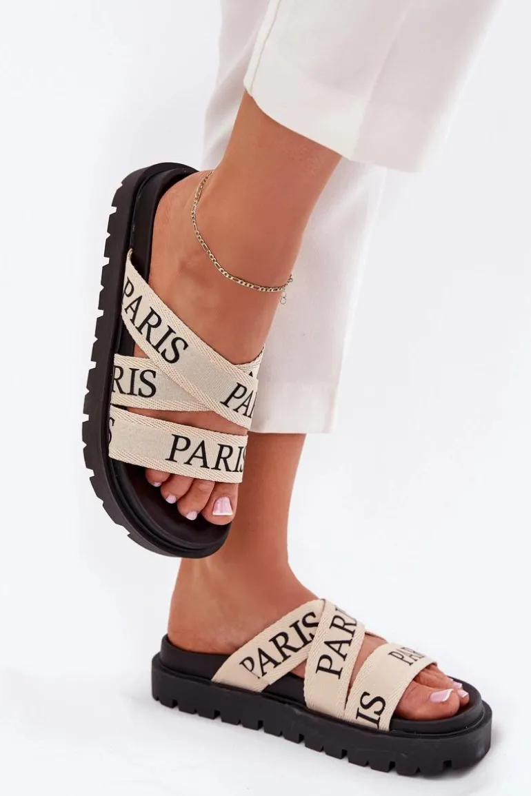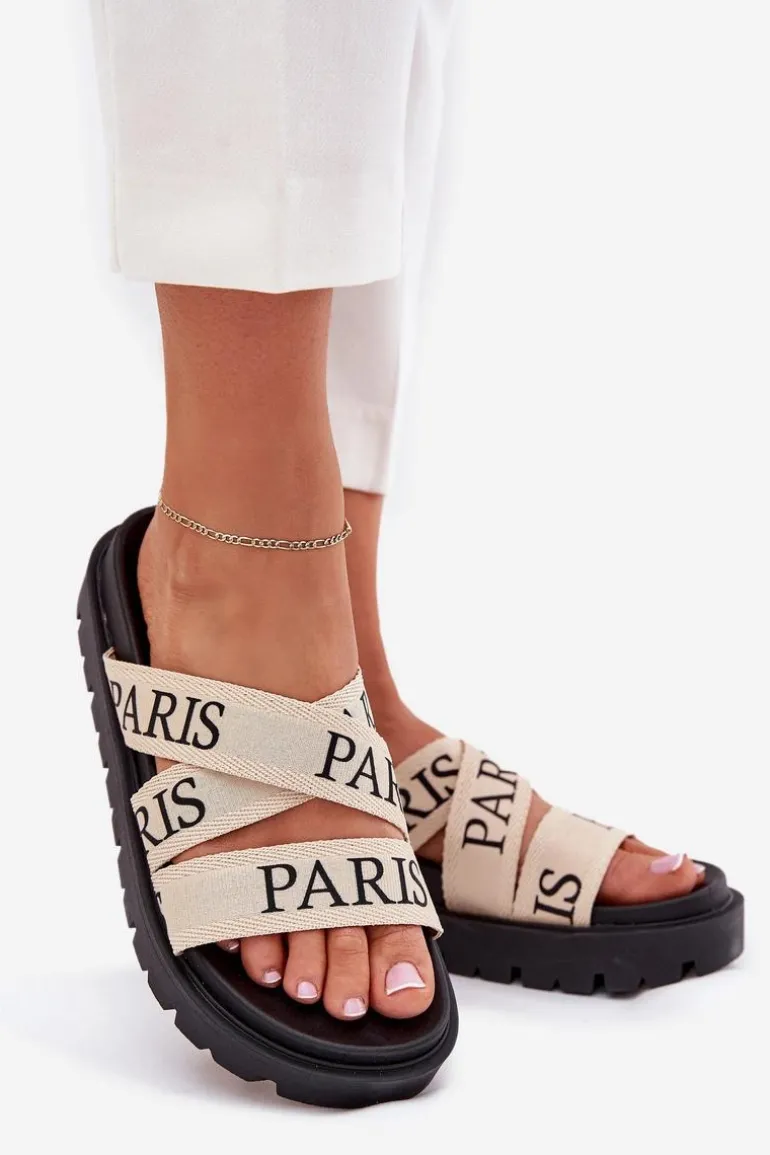 Klapki damskie na platformie z materiałowymi paskami z napisem „PARIS” to stylowy wybór na cieplejsze dni. Ich unikalny wygląd łączy wygodę z modnym akcentem, nadając każdej stylizacji charakteru. Doskonałe do casualowych i wakacyjnych outfitów, zapewniają komfort i nowoczesny wygląd. Przy wyborze rozmiaru rosimy sugerować się tabelą rozmiarów.