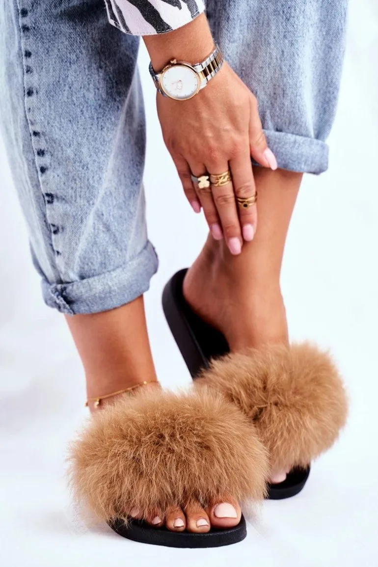 Klapki Damskie z Naturalnym Futerkiem Camel Bushido