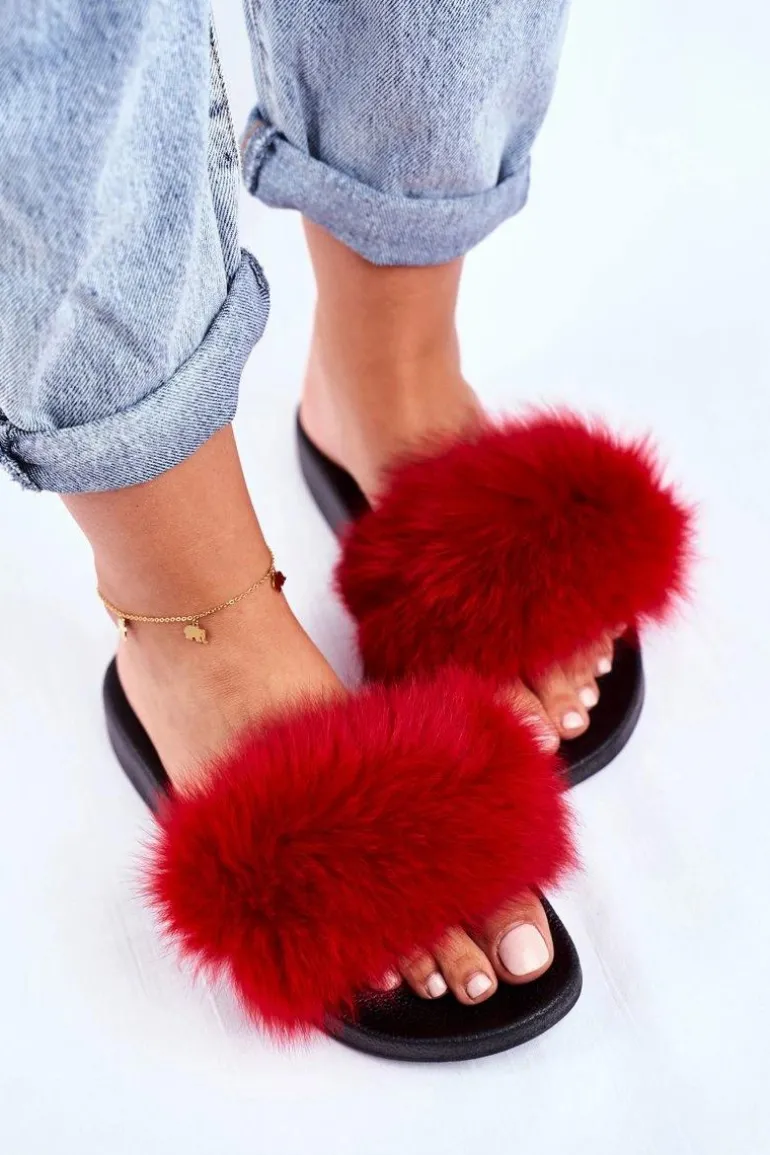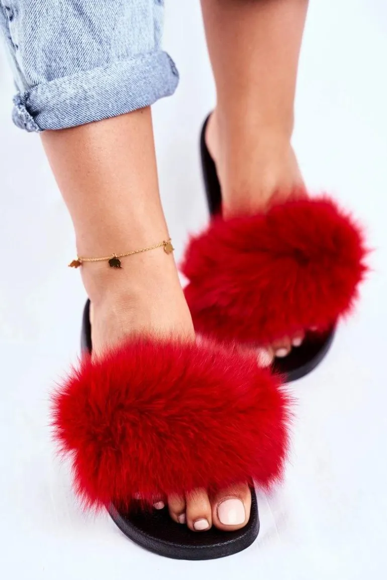 Klapki Damskie z Naturalnym Futerkiem Czerwone Bushido