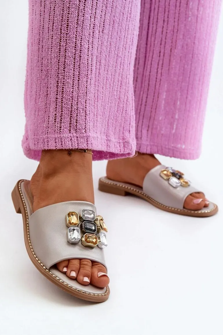 Damskie klapki na płaskim obcasie z ozdobami. Wykonane z wysokiej jakości materiałów. Miękka, skórzana wkładka zapewni komfort noszenia przez cały dzień. Elegancki design sprawia, że są idealnym wyborem na różne okazje. Przy wyborze rozmiaru prosimy sugerować się tabelą rozmiarów.