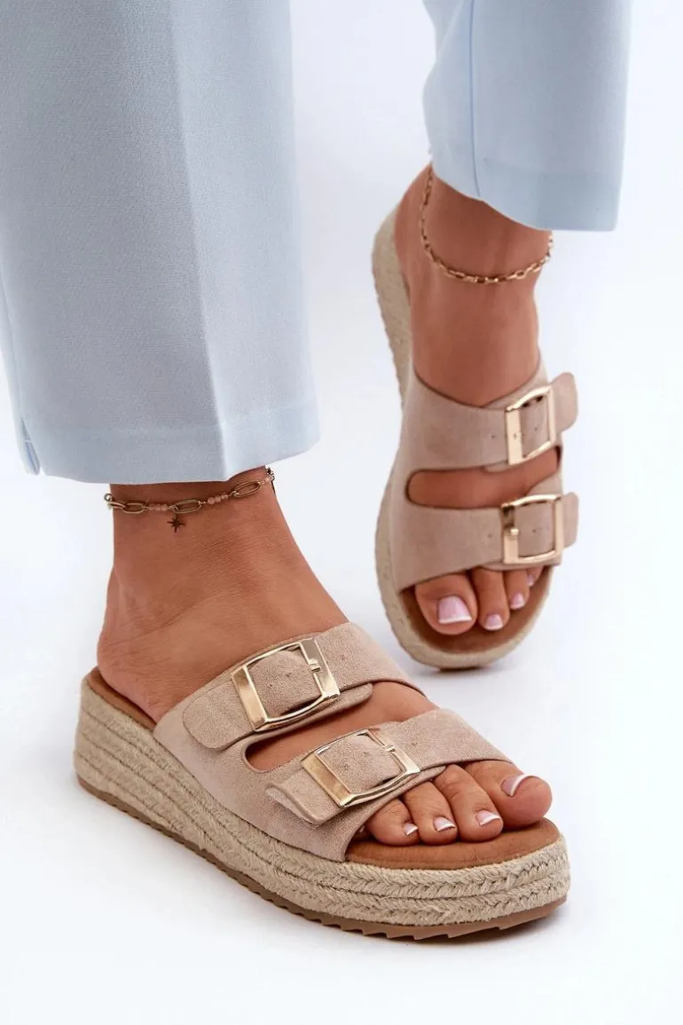 Damskie klapki wykonane z eko zamszu. Osadzone na platformie i lekkim koturnie. Z przodu dwa regulowane paski z klamrami, które zapewniają idealne dopasowanie. Model ten nie tylko prezentuje się świetnie, ale także zapewnia komfort noszenia na co dzień. Przy wyborze rozmiaru prosimy sugerować się tabelą rozmiarów.