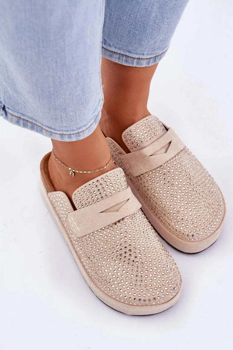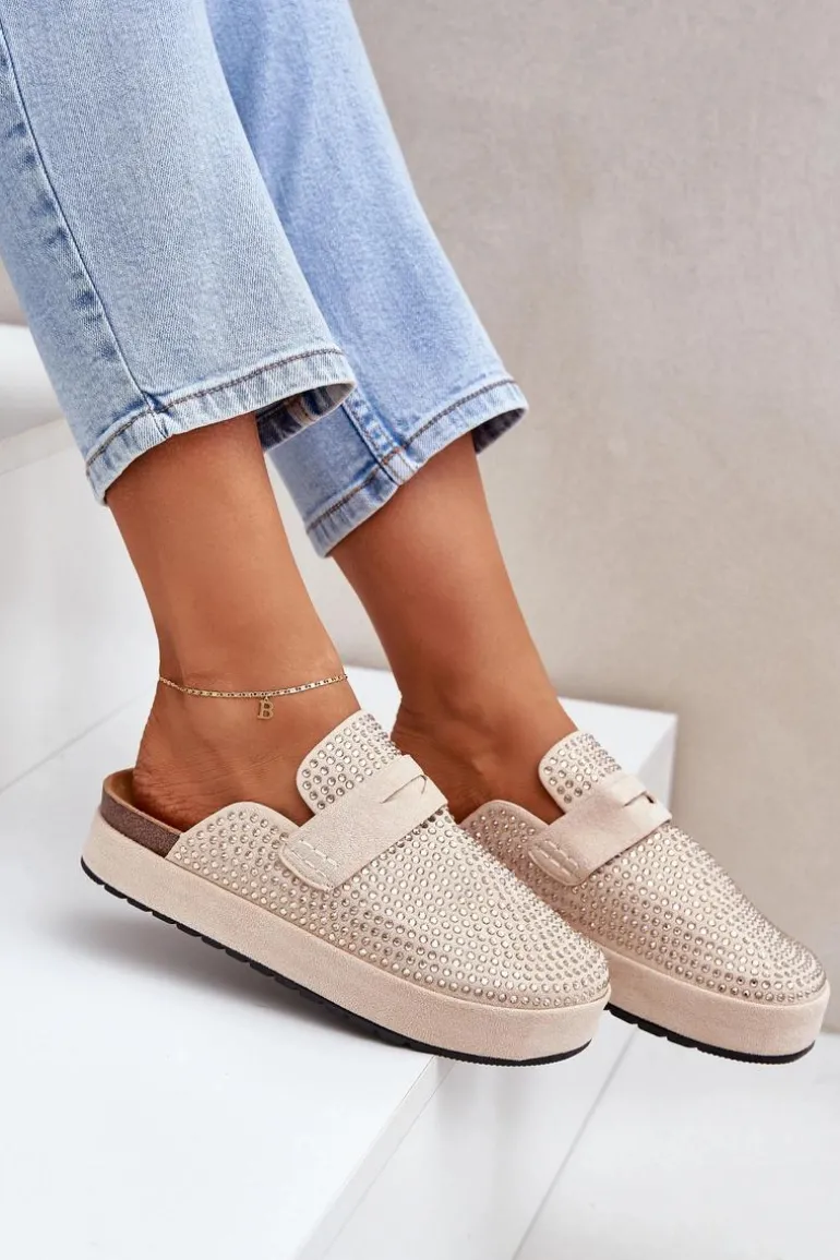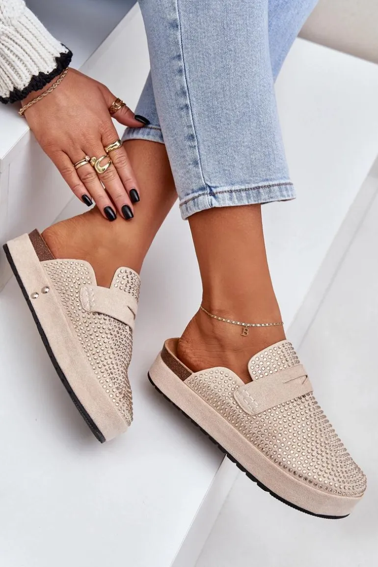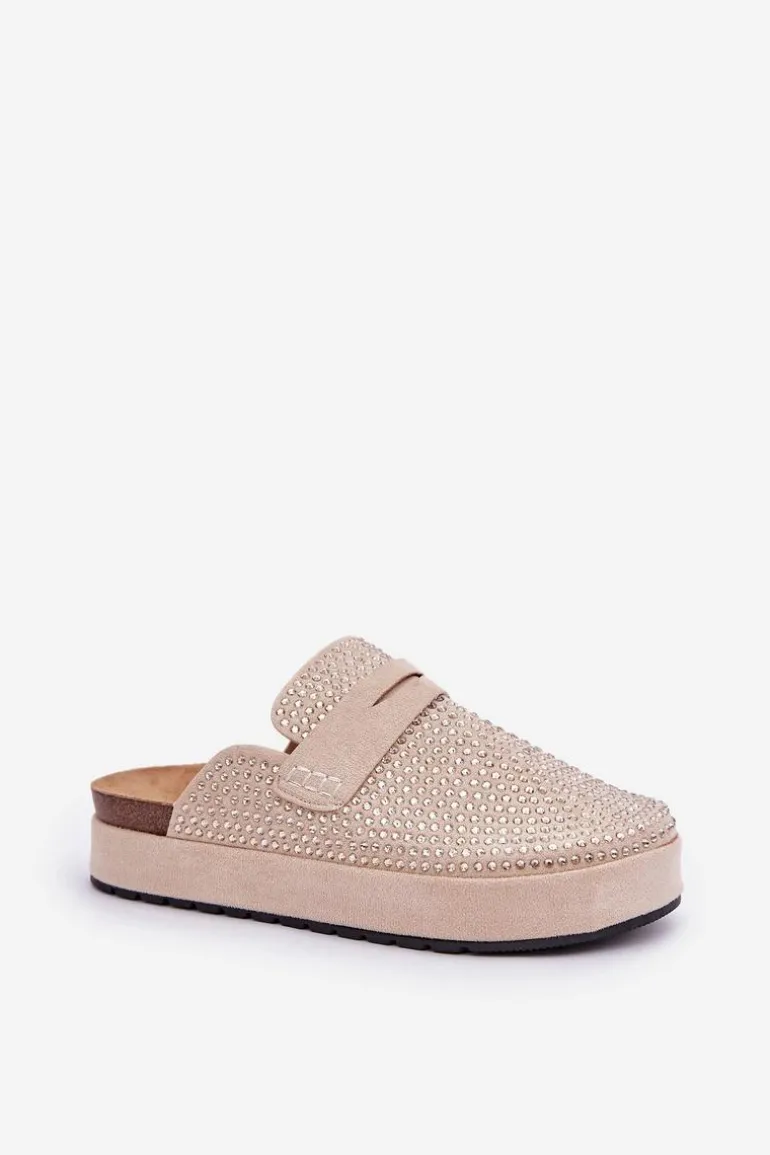 Klapki damskie z eko zamszu. Osadzone na platformie. Model ten wyróżnia się licznymi cyrkoniami, które nadają blasku każdej stylizacji. Noski zakryte, zaokrąglone. Lekko profilowana wkładka zapewni wygodę. Stylowy fason, który z pewnością dopełni wiele letnich stylizacji! Przy wyborze rozmiaru prosimy sugerować się tabelą rozmiarów.