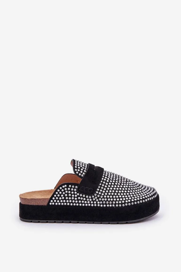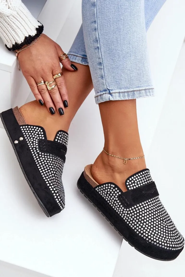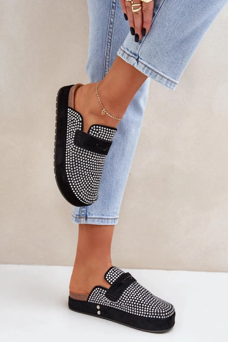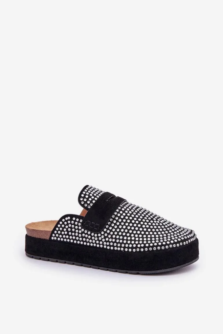 Klapki damskie z eko zamszu. Osadzone na platformie. Model ten wyróżnia się licznymi cyrkoniami, które nadają blasku każdej stylizacji. Noski zakryte, zaokrąglone. Lekko profilowana wkładka zapewni wygodę. Stylowy fason, który z pewnością dopełni wiele letnich stylizacji! Przy wyborze rozmiaru prosimy sugerować się tabelą rozmiarów.