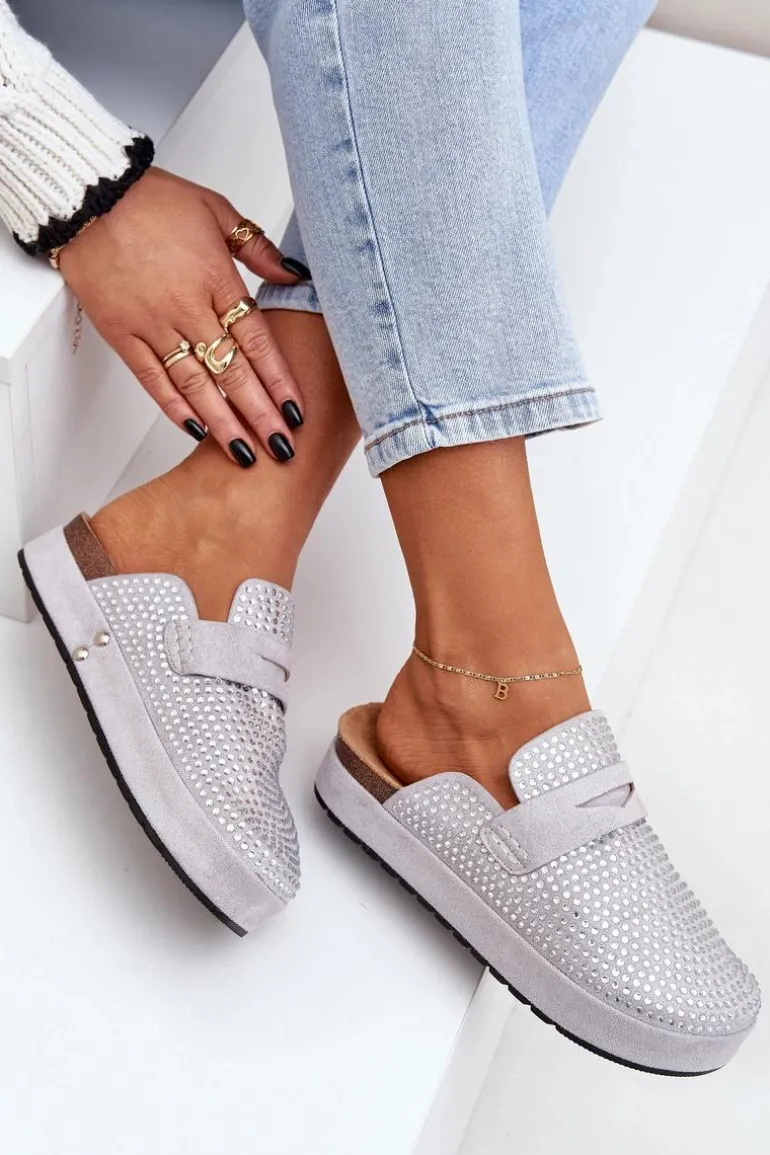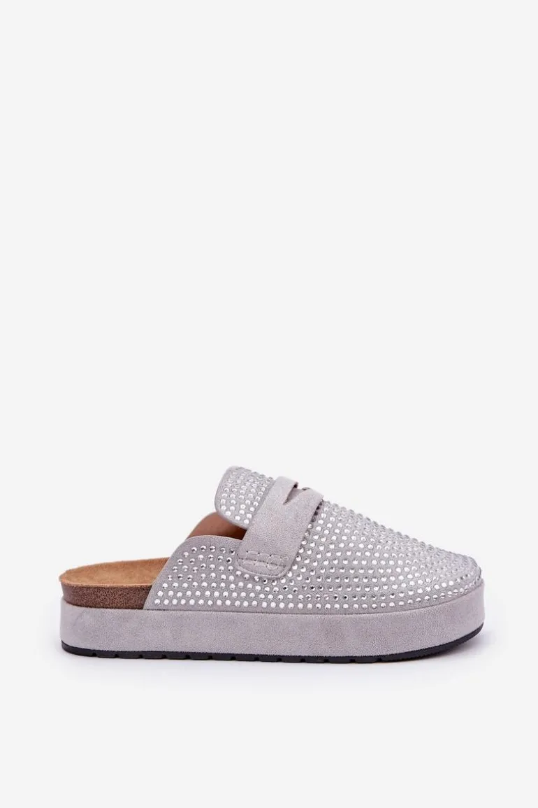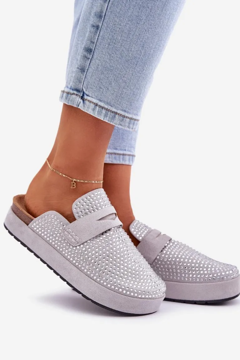 Klapki damskie z eko zamszu. Osadzone na platformie. Model ten wyróżnia się licznymi cyrkoniami, które nadają blasku każdej stylizacji. Noski zakryte, zaokrąglone. Lekko profilowana wkładka zapewni wygodę. Stylowy fason, który z pewnością dopełni wiele letnich stylizacji! Przy wyborze rozmiaru prosimy sugerować się tabelą rozmiarów.