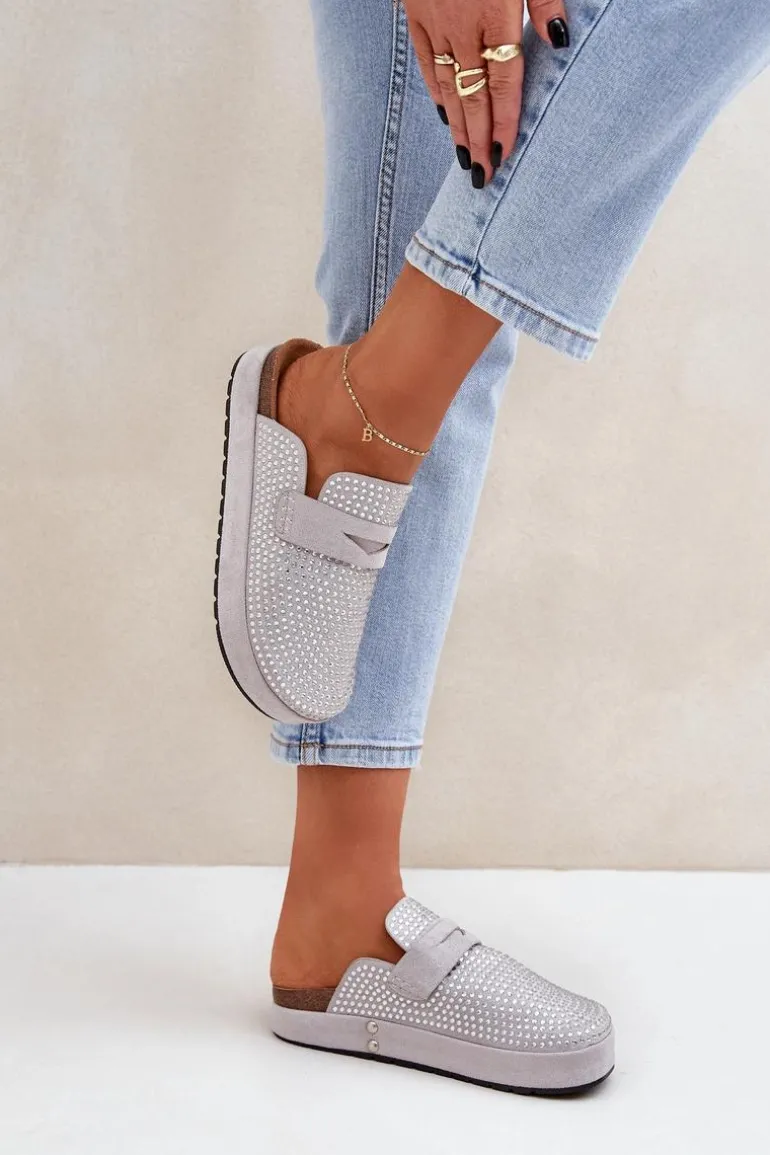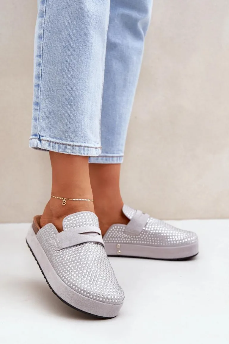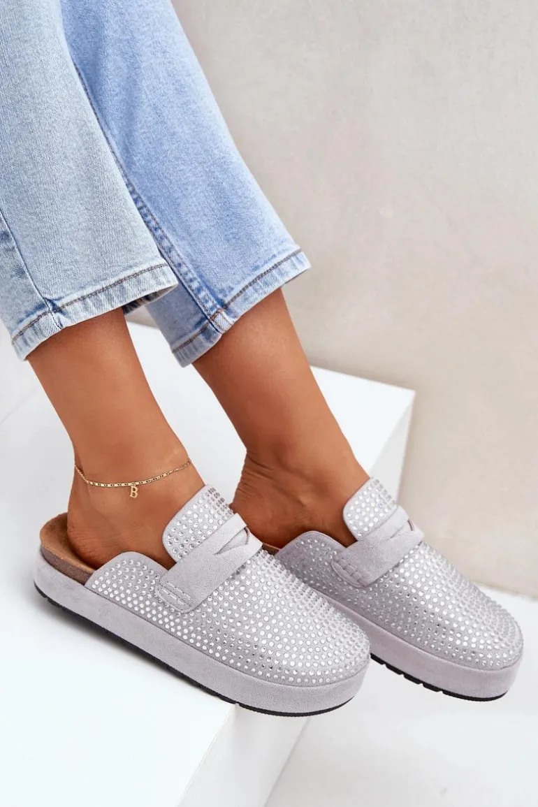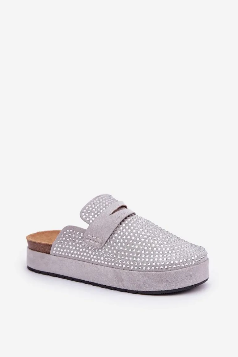 Klapki damskie z eko zamszu. Osadzone na platformie. Model ten wyróżnia się licznymi cyrkoniami, które nadają blasku każdej stylizacji. Noski zakryte, zaokrąglone. Lekko profilowana wkładka zapewni wygodę. Stylowy fason, który z pewnością dopełni wiele letnich stylizacji! Przy wyborze rozmiaru prosimy sugerować się tabelą rozmiarów.