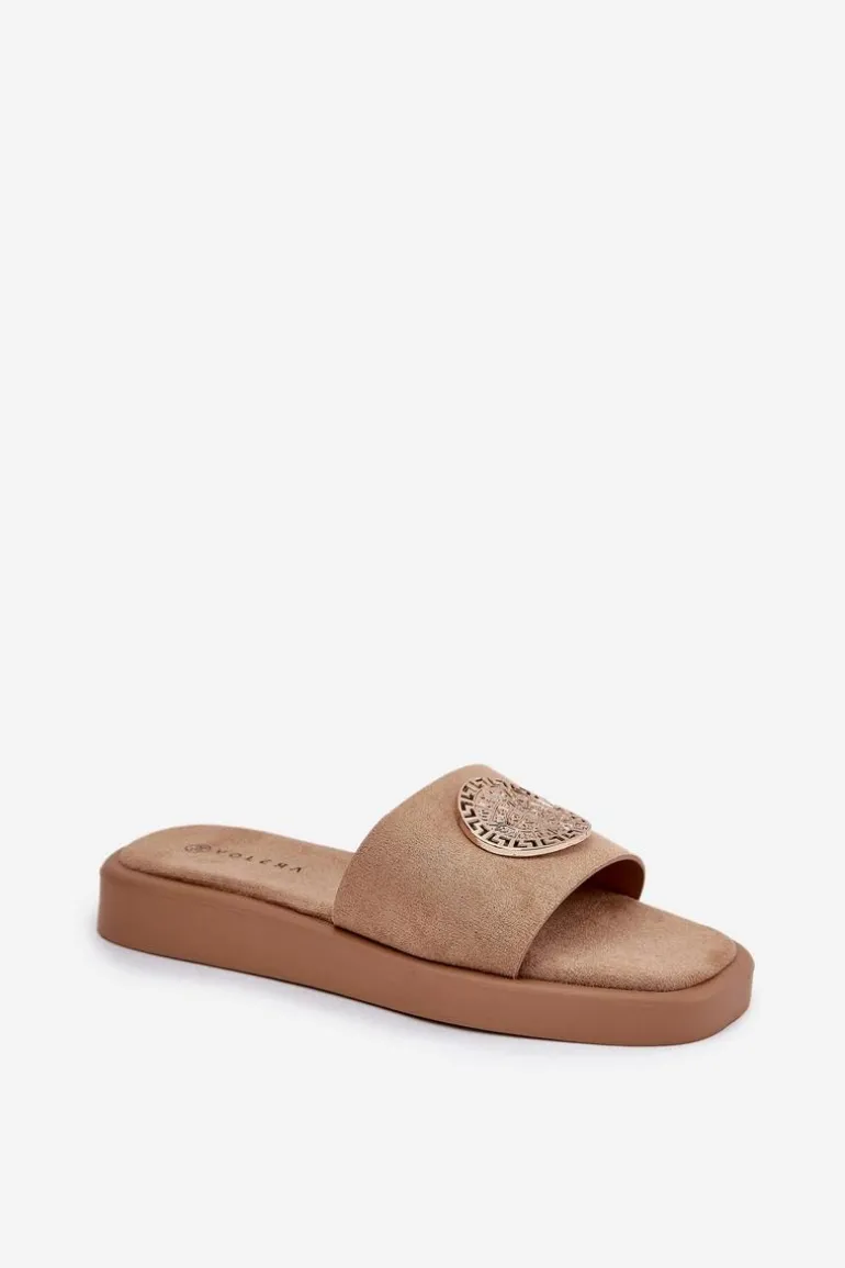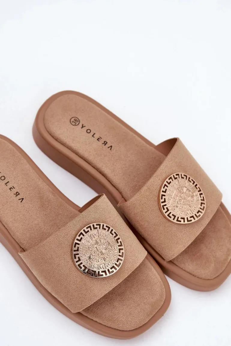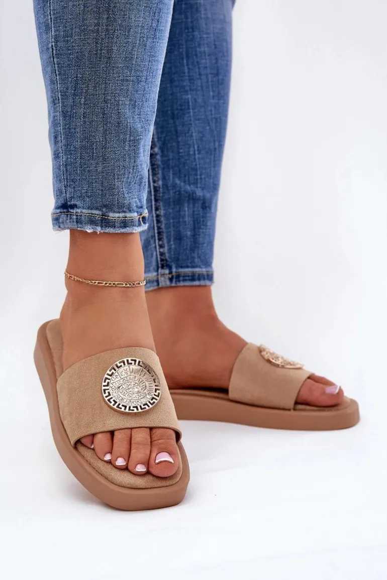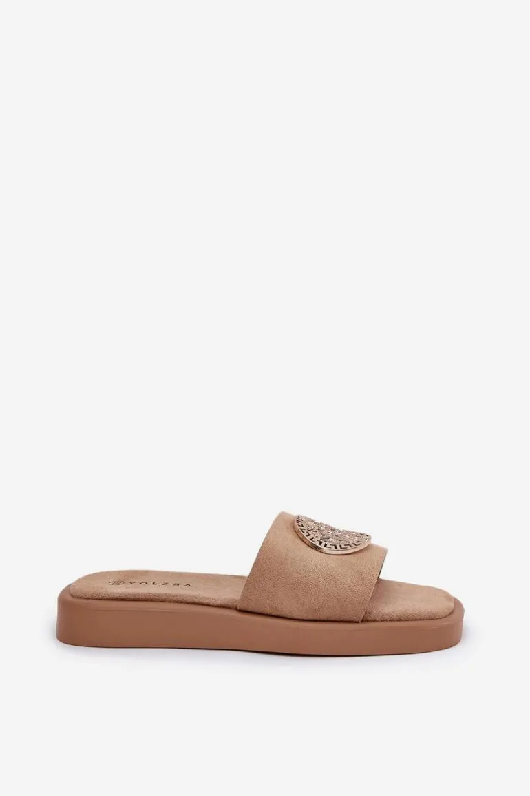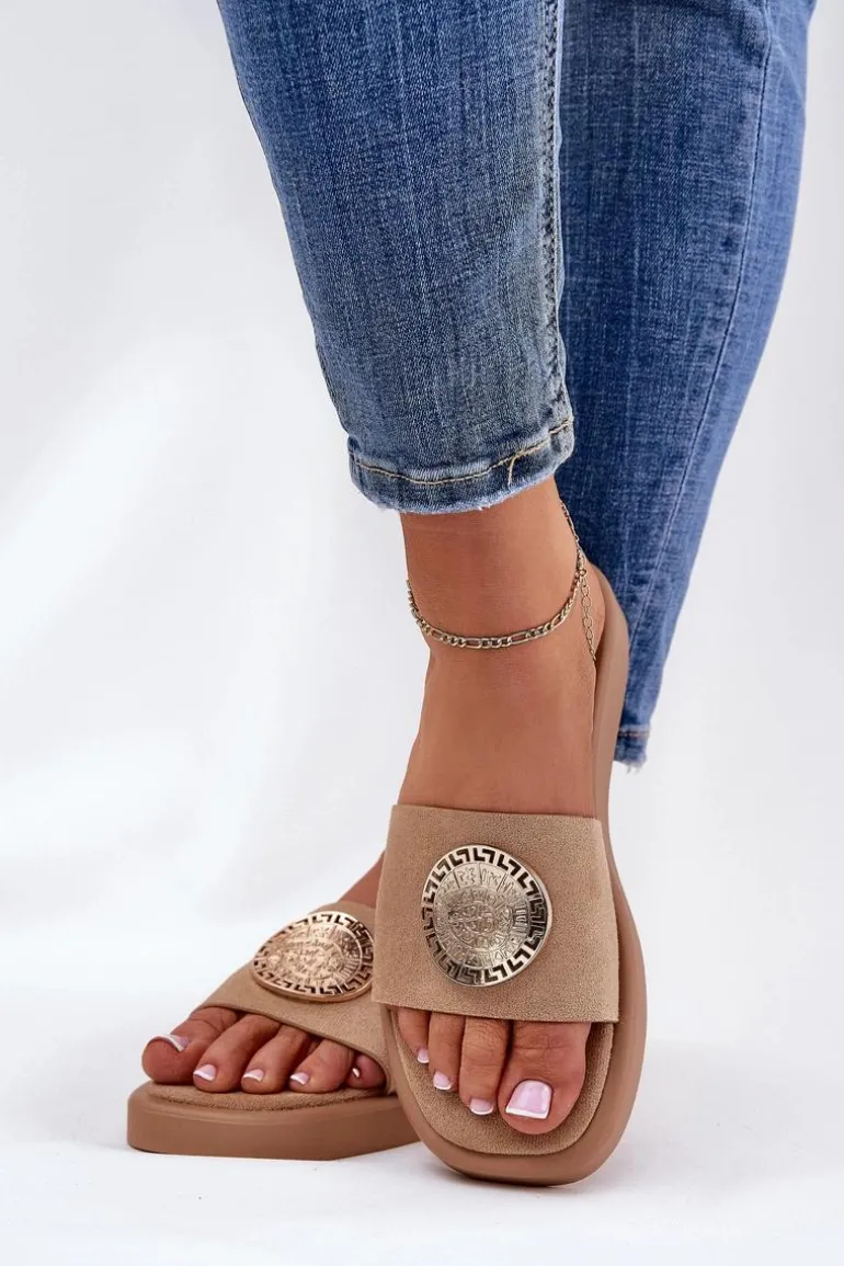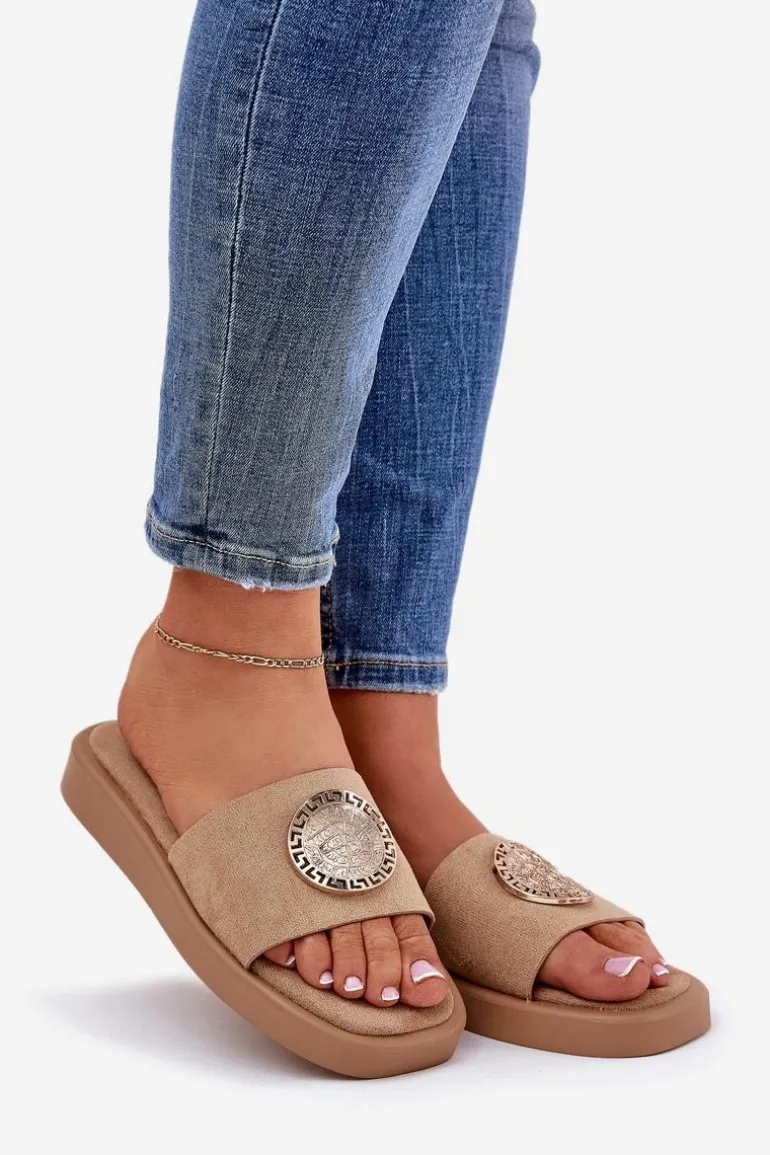 Klapki damskie wykonane z eko zamszu. Osadzone na platformie. Złota ozdoba na pasku dodaje im subtelnej elegancji, czyniąc je idealnym wyborem na letnie wieczorne wyjścia. Doskonale komponują się także z casualowymi stylizacjami, łącząc styl z komfortem. Przy wyborze rozmiaru prosimy sugerować się tabelą rozmiarów.