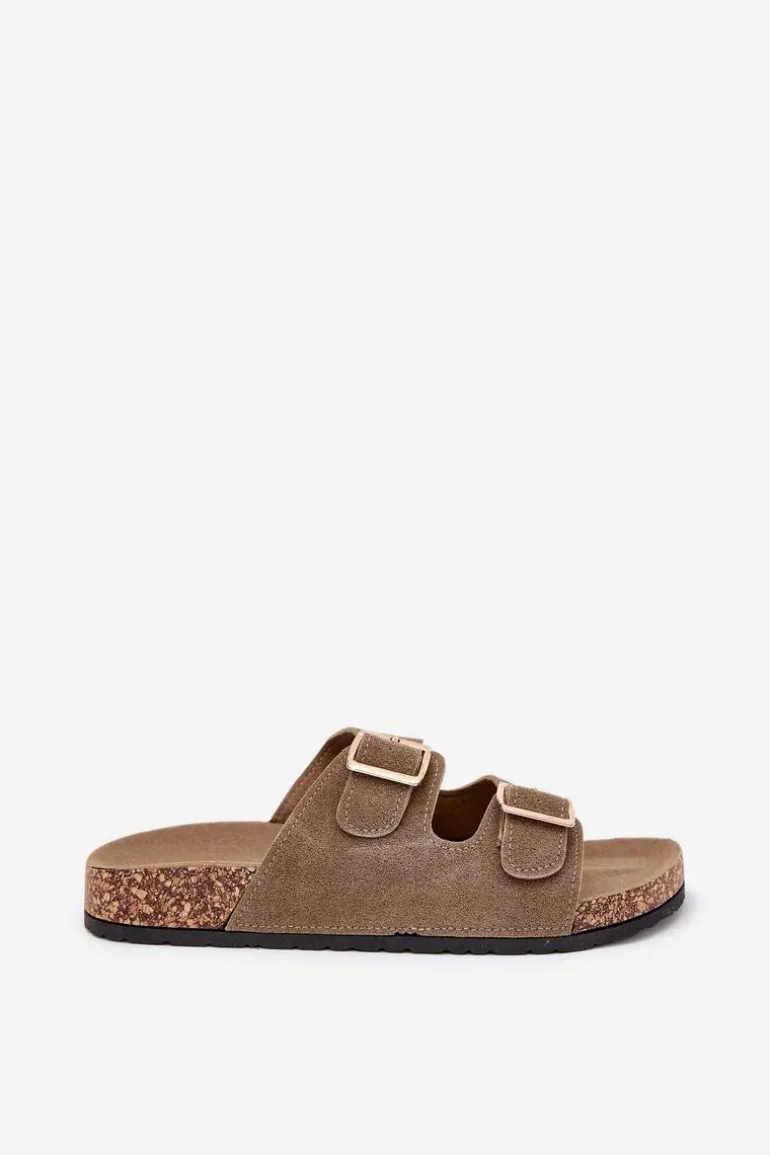 Klapki damskie z eko zamszu, osadzone na korkowej platformie, to połączenie stylu i wygody. Dwie złote klamry z regulowanymi paskami pozwalają na idealne dopasowanie do stopy, a profilowana wkładka zapewnia komfort przez cały dzień. Idealne do letnich stylizacji, doskonale pasują do sukienek, spódnic czy szortów. Przy wyborze rozmiaru prosimy sugerować się tabelą rozmiarów.