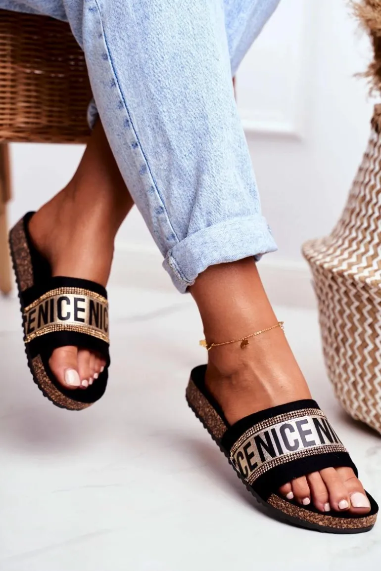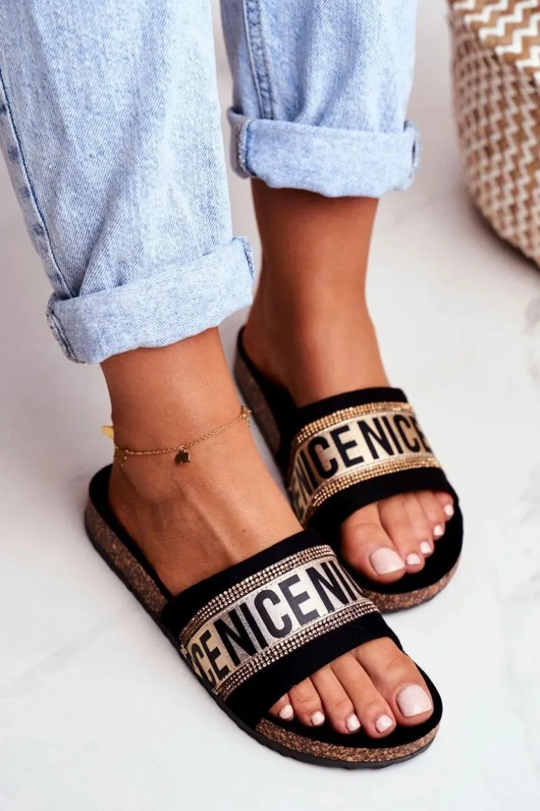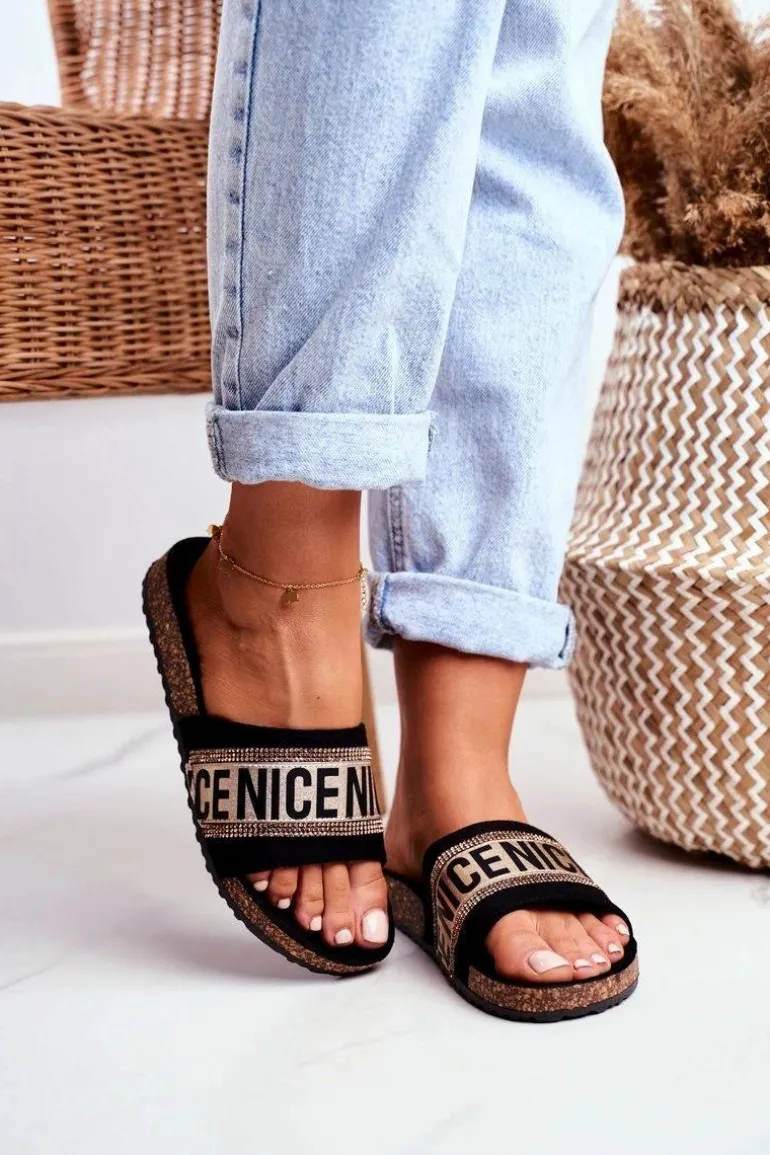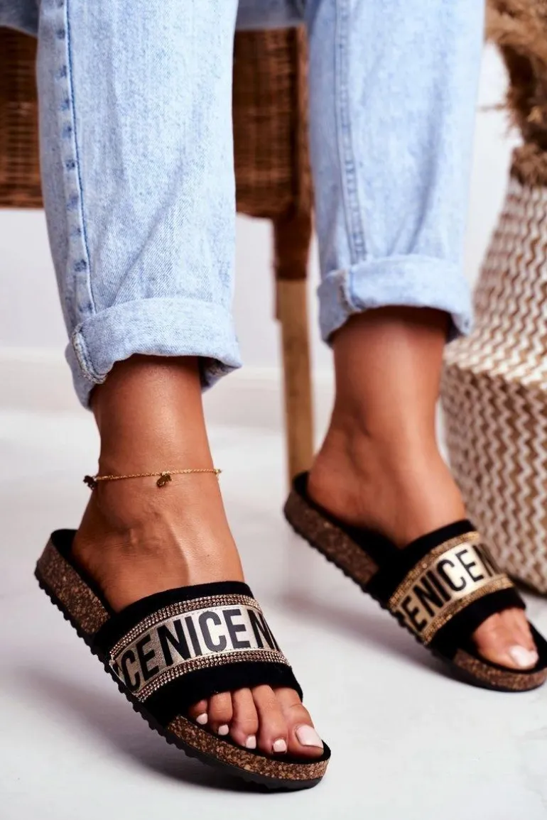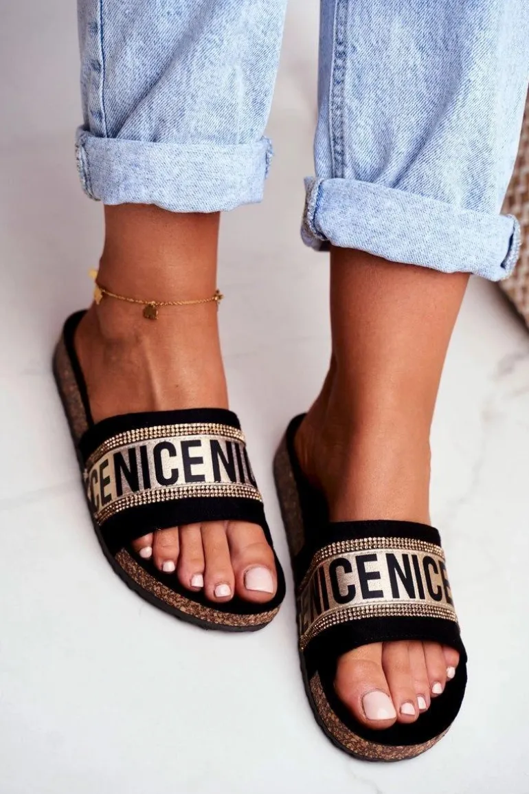 Komfortowe klapki damskie na korkowej podeszwie. Buty wykonane są z eko zamszu, posiadają delikatnie profilowaną wkładkę. Mody fason z cyrkoniami urozmaici Twoją garderobę!