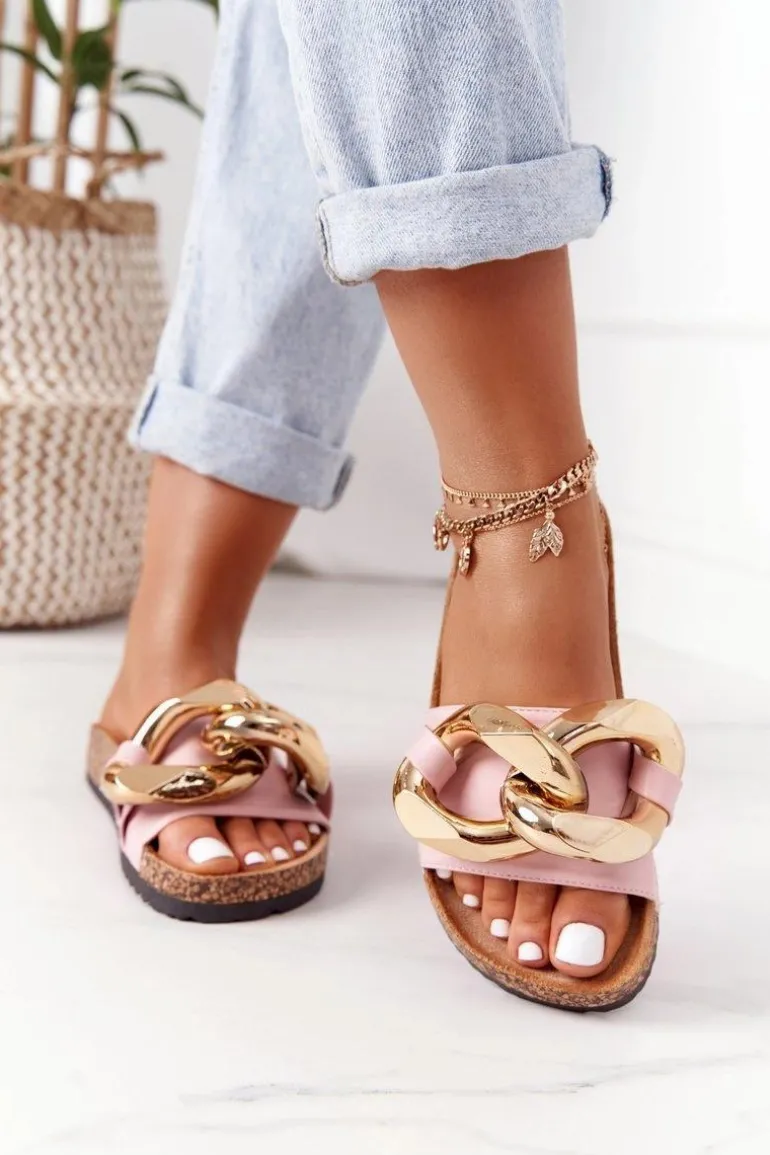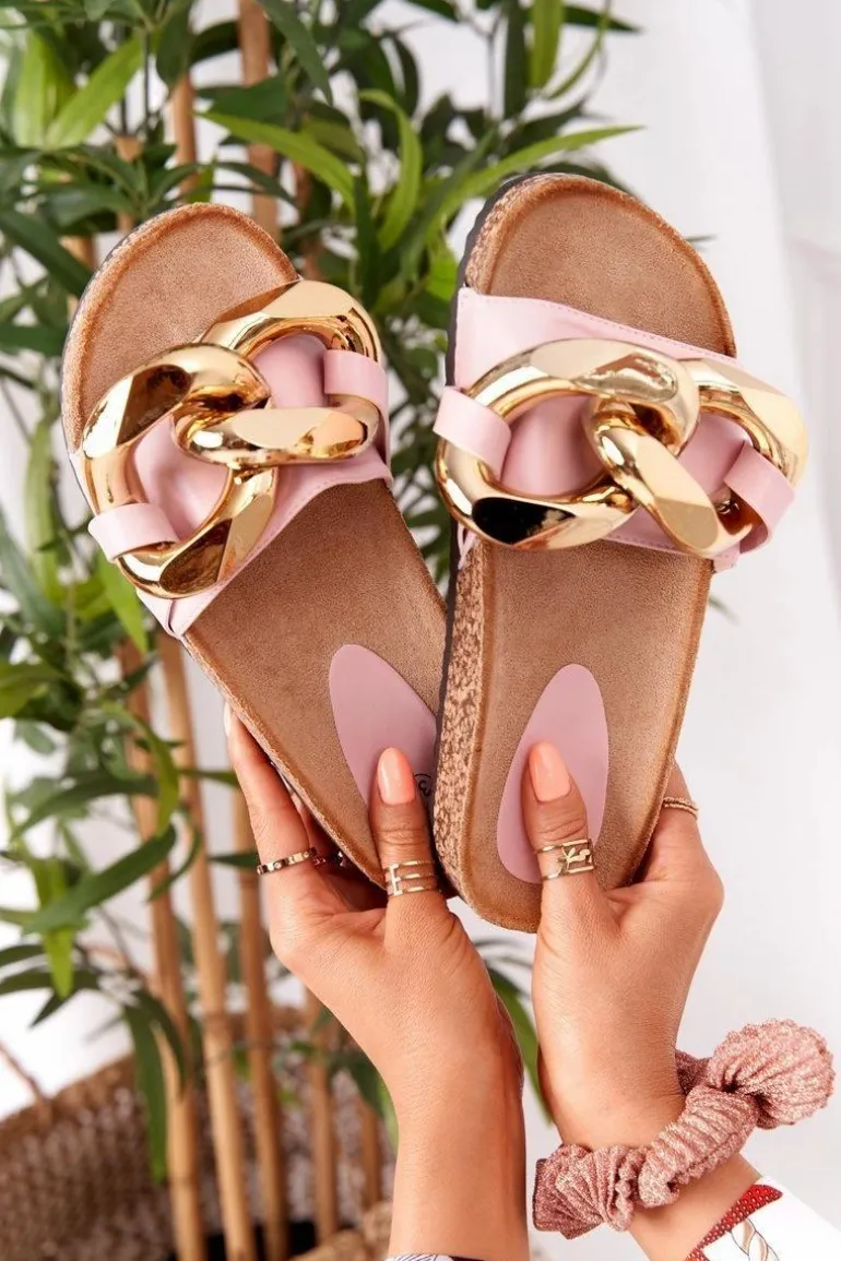 Wyjątkowe klapki damskie wykonane z eko skóry. Buty posiadają profilowaną wkładkę, która zagwarantuje komfort. Modny fason z masywnym łańcuchem urozmaici Twoje stylizacje! Przy wyborze rozmiaru prosimy sugerować się tabelą rozmiarów.