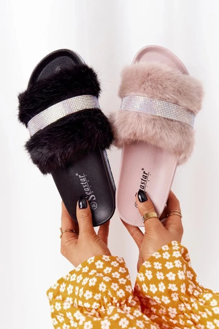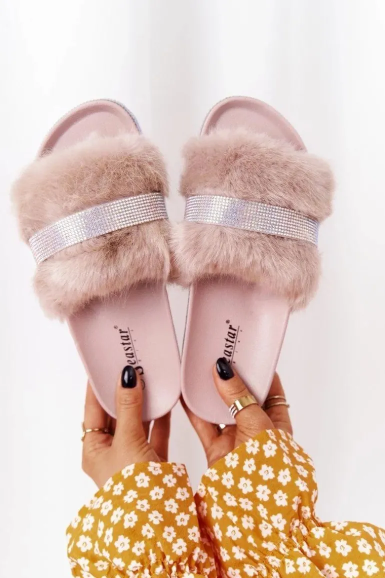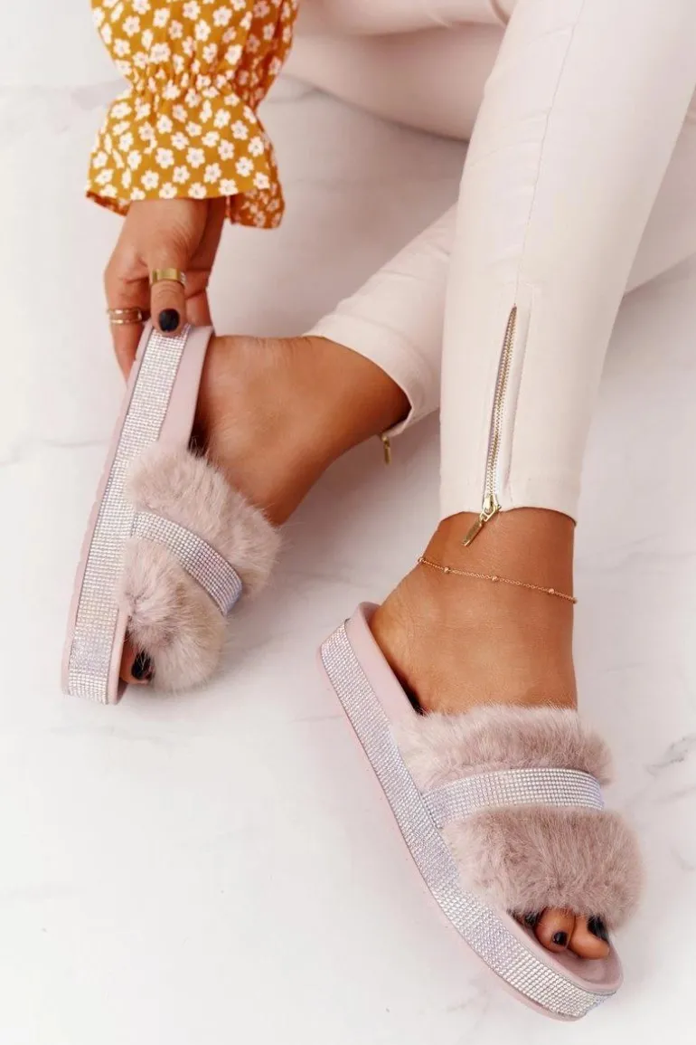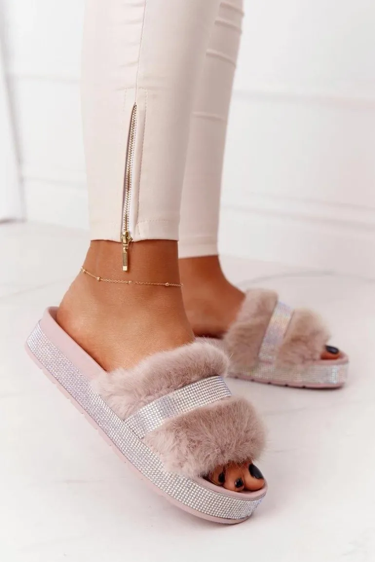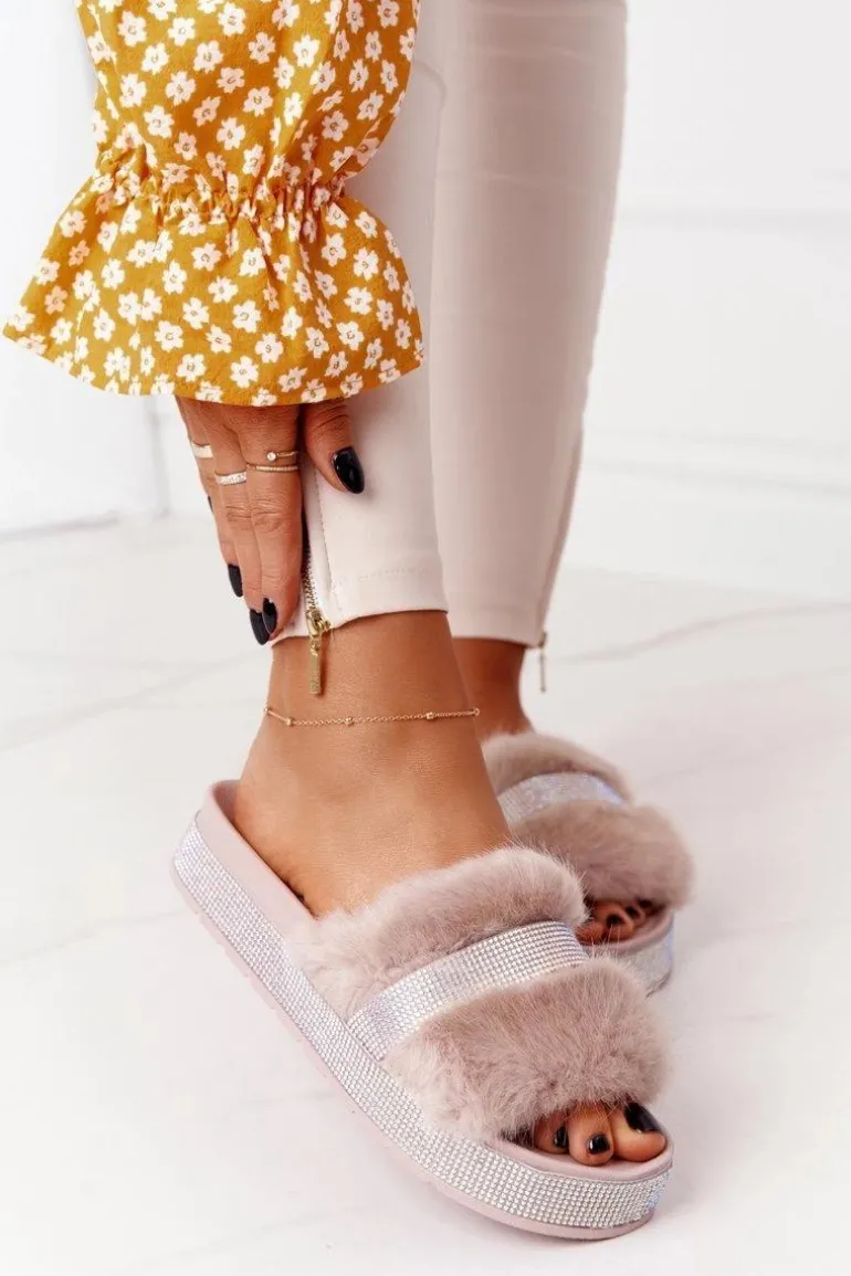 Klapki Na Platformie Z Futerkiem I Cyrkoniami Beżowe Impress