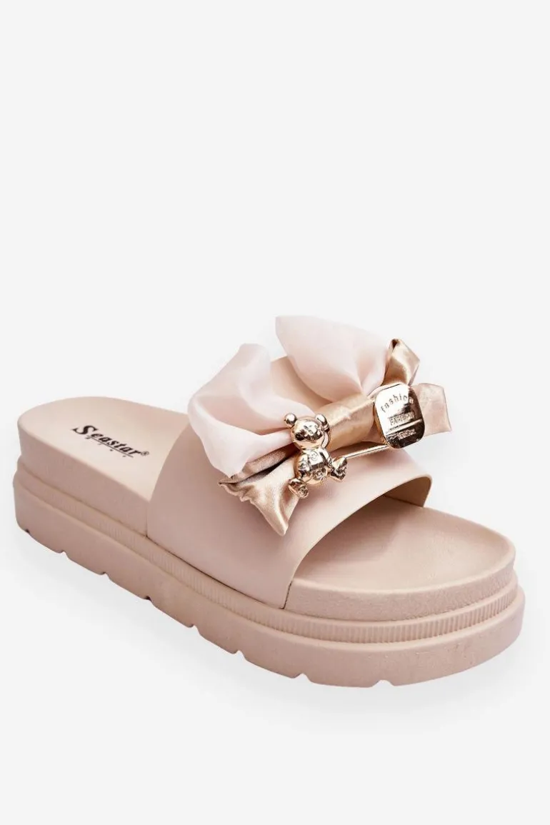 Cudowne, damskie klapki wykonane z eko skóry. Model ten posiada materiałową kokardę i imitację agrafki z misiem i blaszką z napisem. Osadzone na masywnej platformie. Wkładka została wykonana z tworzywa sztucznego. Idealne klapki na nadchodzący sezon! Koniecznie powinnaś je mieć! Przy wyborze rozmiaru prosimy sugerować się tabelą rozmiarów.
