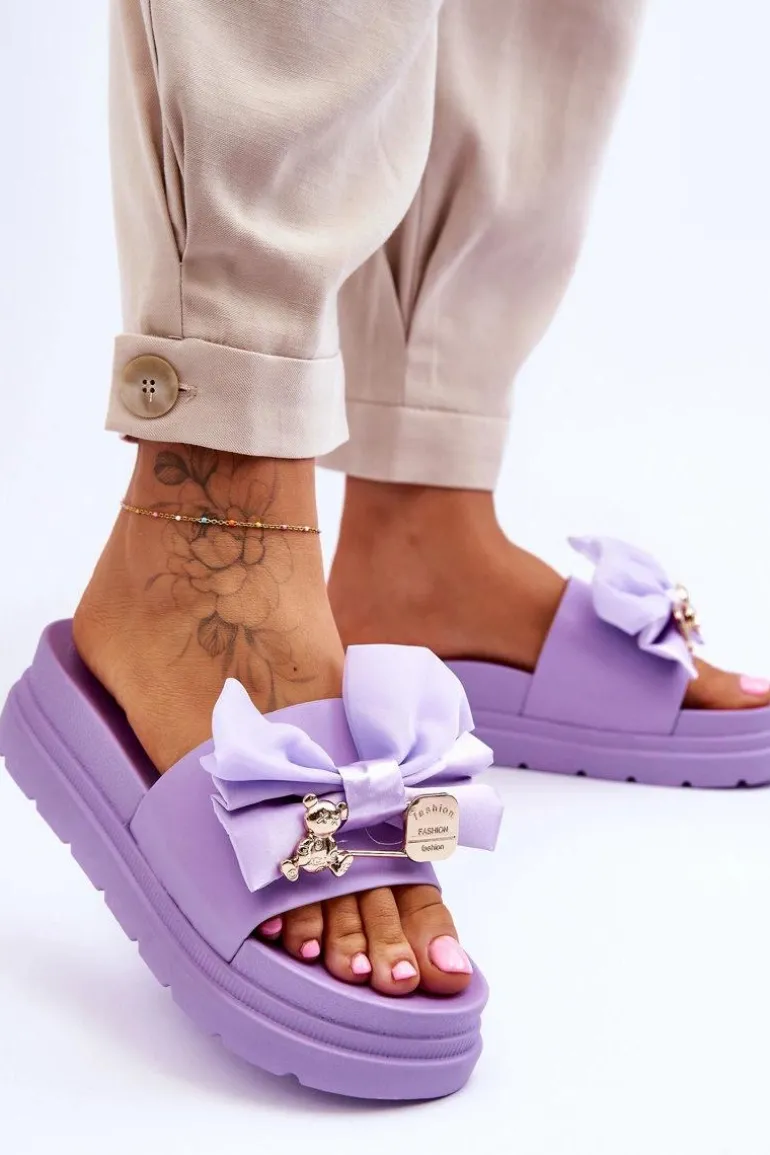 Cudowne, damskie klapki wykonane z eko skóry. Model ten posiada materiałową kokardę i imitację agrafki z misiem i blaszką z napisem. Osadzone na masywnej platformie. Wkładka została wykonana z tworzywa sztucznego. Idealne klapki na nadchodzący sezon! Koniecznie powinnaś je mieć! Przy wyborze rozmiaru prosimy sugerować się tabelą rozmiarów.