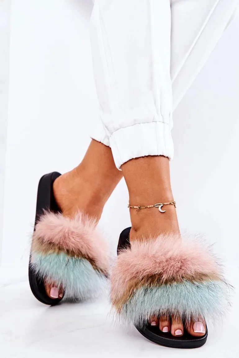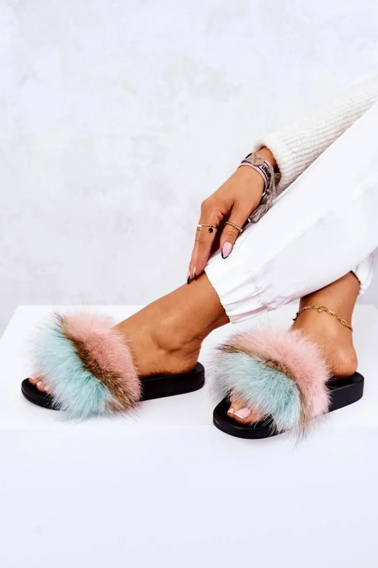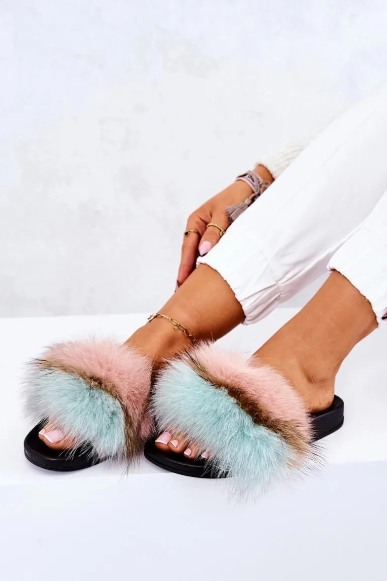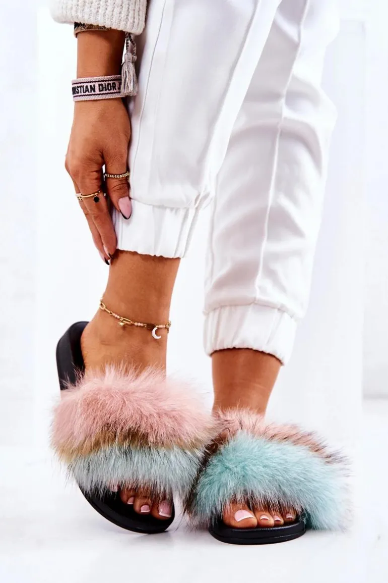 Klapki Z Naturalnym Futerkiem Różowo-Zielone Naturis
