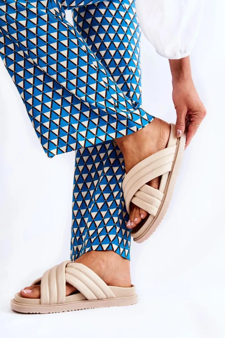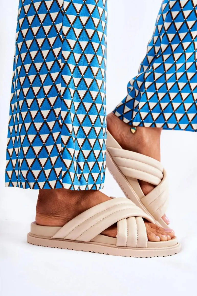 Klapki świetnie sprawdzą się podczas upalnych dni! Klasyczny, wsuwany model został wykonany z eko skóry. Krzyżujące się paseczki posiadają przeszycia. Klapki osadzone na delikatnej platformie wykonanej z tworzywa sztucznego. Wkładka jest profilowana, wykonana z tworzywa gumowego. Model ten posiada odkryty, zaokrąglony nosek. Koniecznie sprawdź pozostałe modele klapek dostępnych w naszej ofercie! Podczas wyboru rozmiaru prosimy sugerować się tabelą rozmiarów.