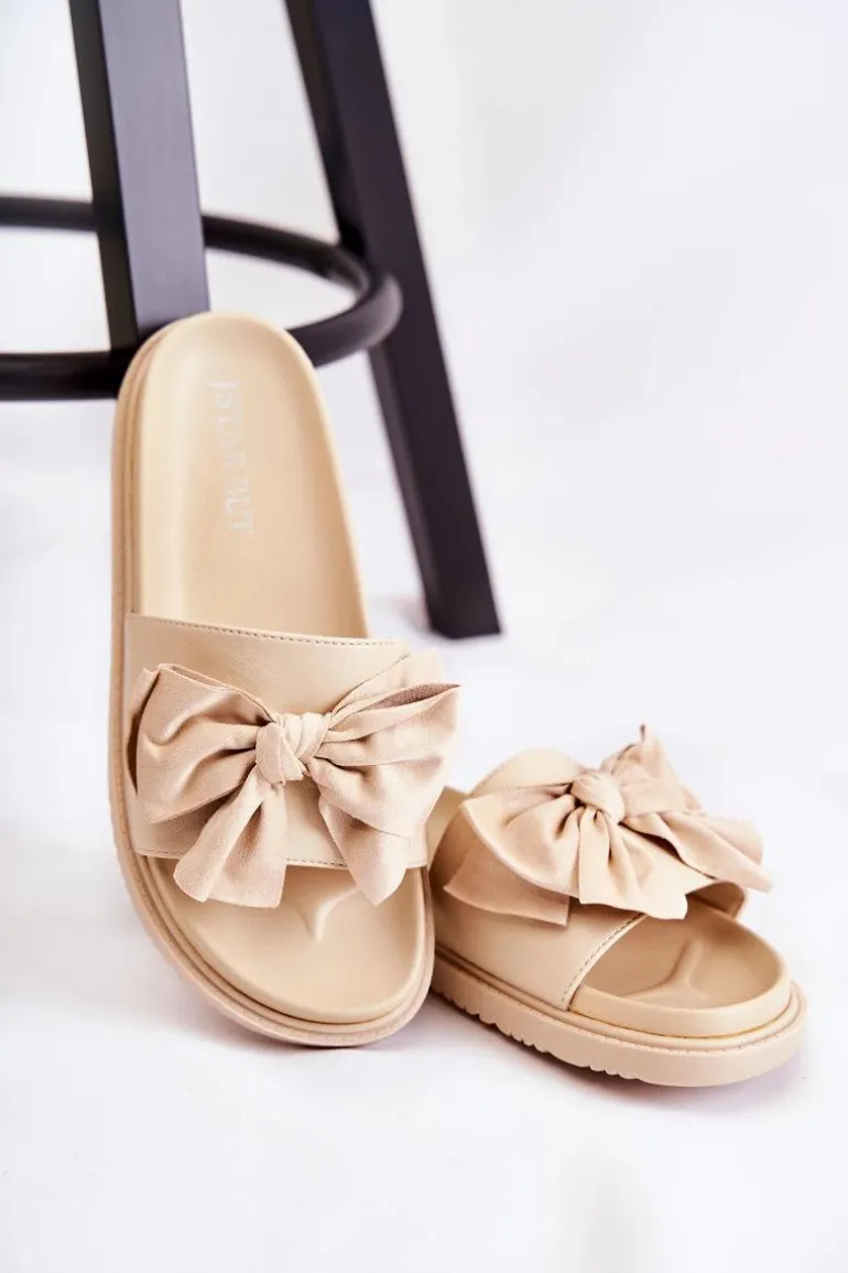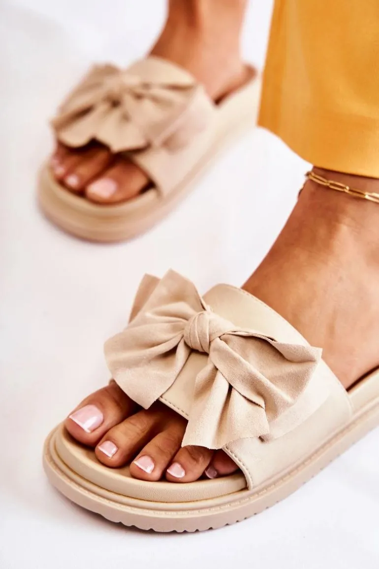 Modne klapki świetnie sprawdzą się podczas upalnych dni! Klasyczny, wsuwany model został wykonany z eko skóry. Eko zamszowa kokarda na przodzie dodaje tym butom elegancji. Klapki osadzone na delikatnej platformie wykonanej z tworzywa sztucznego. Wkładka jest profilowana, wykonana z tworzywa gumowego. Model ten posiada odkryty, zaokrąglony nosek. Podczas wyboru rozmiaru prosimy sugerować się tabelą rozmiarów.