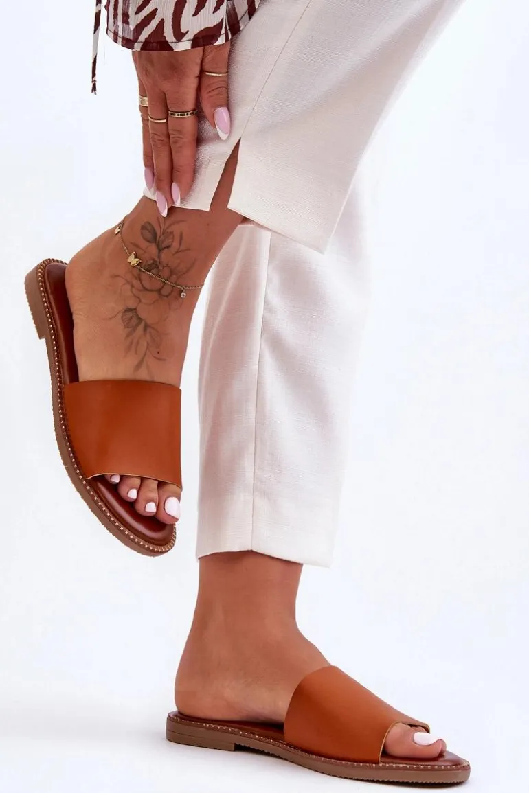 Klasyczne, damskie klapki zostały wykonane z eko skóry. Model ten został osadzony na płaskim obcasie i podeszwie z tworzywa sztucznego. Dodatkowo klapki posiadają wokół podeszwy zdobienia. Miękka wkładka w tym obuwiu zapewni komfortowe użytkowanie. Koniecznie powinnaś mieć ten model w swojej szafie! Przy wyborze rozmiaru prosimy sugerować się tabelą rozmiarów.