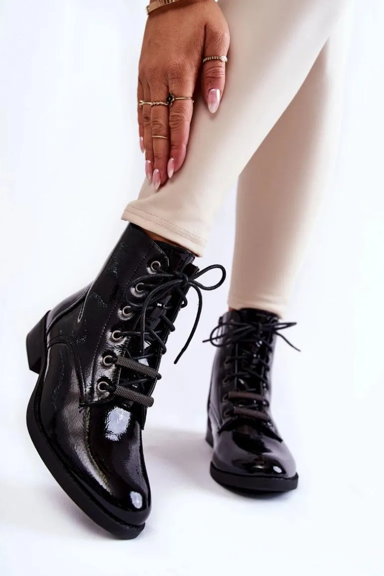 Klasyczne i eleganckie botki ze skóry ekologicznej. Wnętrze pokryte jest ciepłym i miłym w dotyku futerkiem, które gwarantuje komfort w każdej sytuacji. Botki osadzono na płaski m obcasie. Klasyczne sznurowanie na przodzie zostało przyozdobione blaszkami. Dodatkowo botki posiadają suwak z boku cholewki oraz usztywniany zapiętek. Koniecznie sprawdź całą naszą ofertę botków! Przy wyborze rozmiaru prosimy sugerować się tabelą rozmiarów.