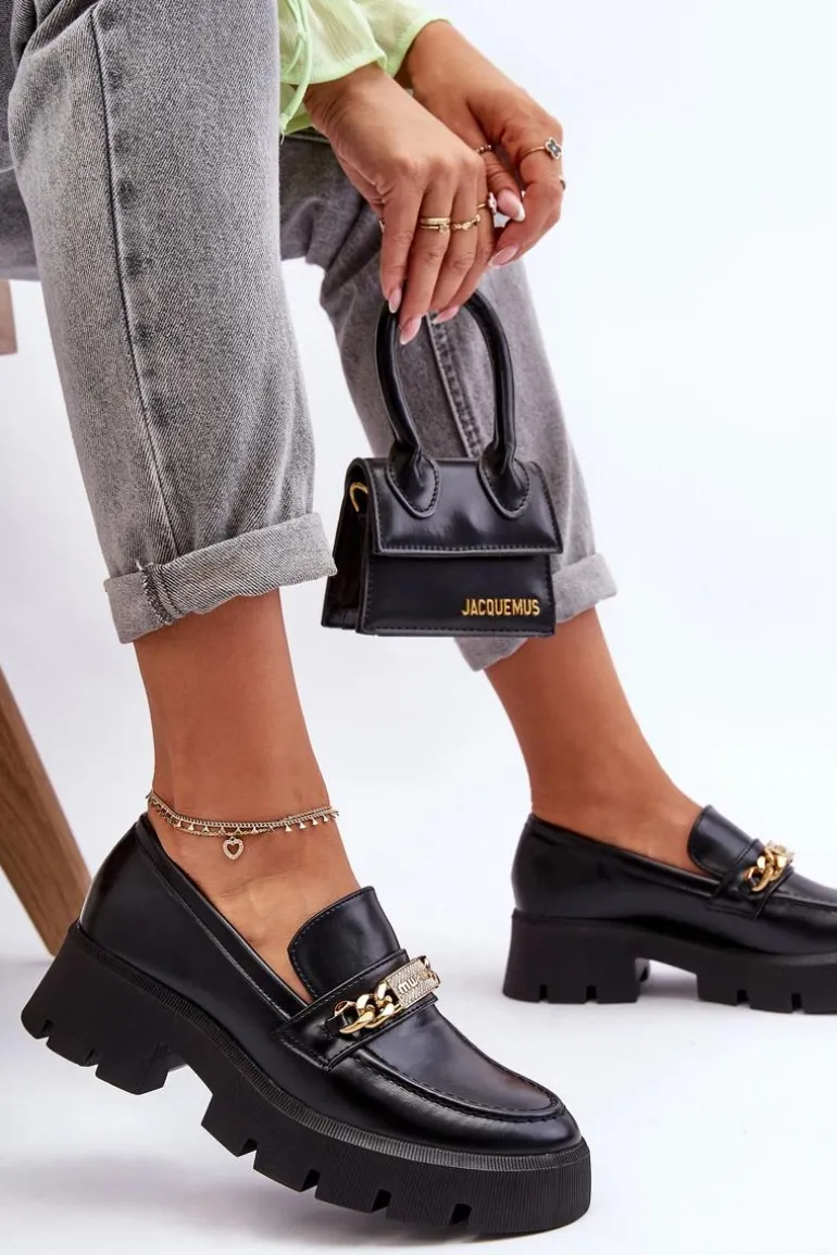 Te modne, damskie mokasyny świetnie sprawdzą się do wielu stylizacji! Osadzono je na masywnej platformie i płaskim obcasie. Mokasyny posiadają delikatnie usztywniany zapiętek oraz wkładkę z eko skóry. Na pasku z przodu znajduje się łańcuszek z ozdobną blaszką z dżetami. Koniecznie powinnaś mieć ten model! Przy wyborze rozmiaru prosimy sugerować się tabelą rozmiarów.