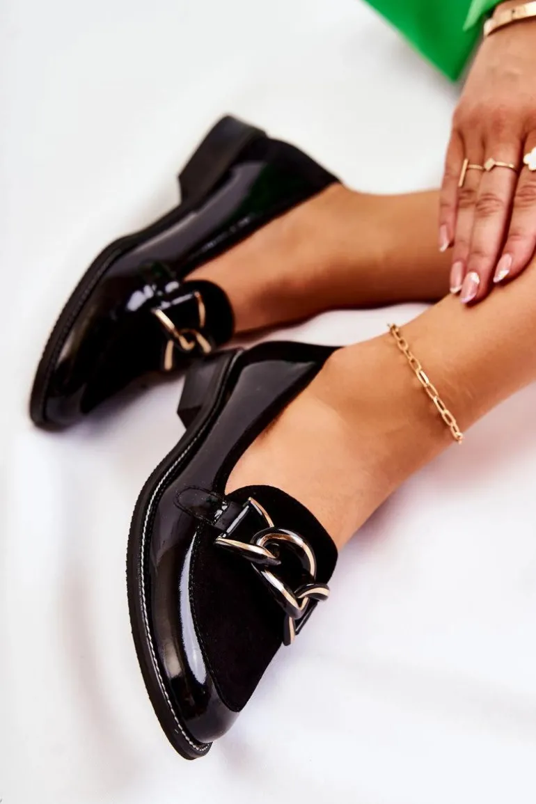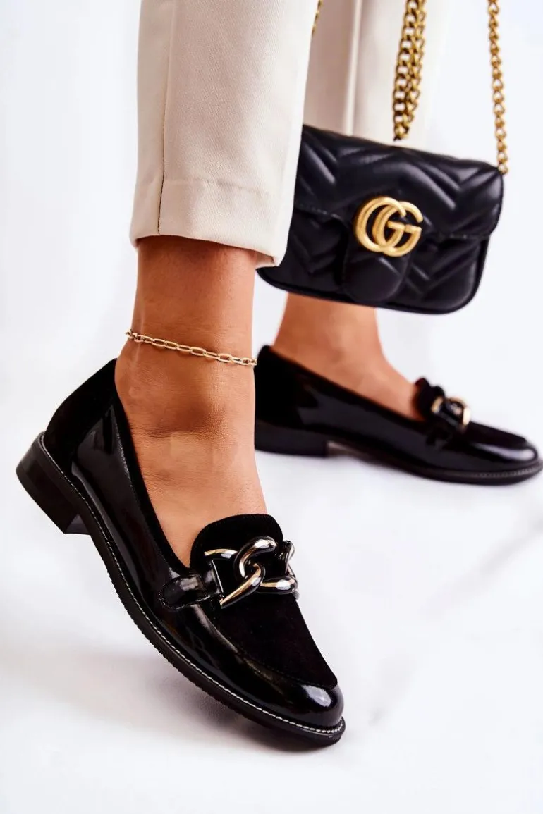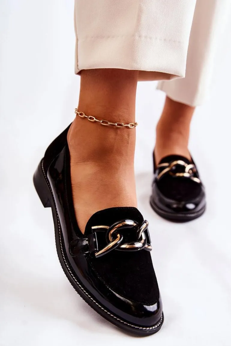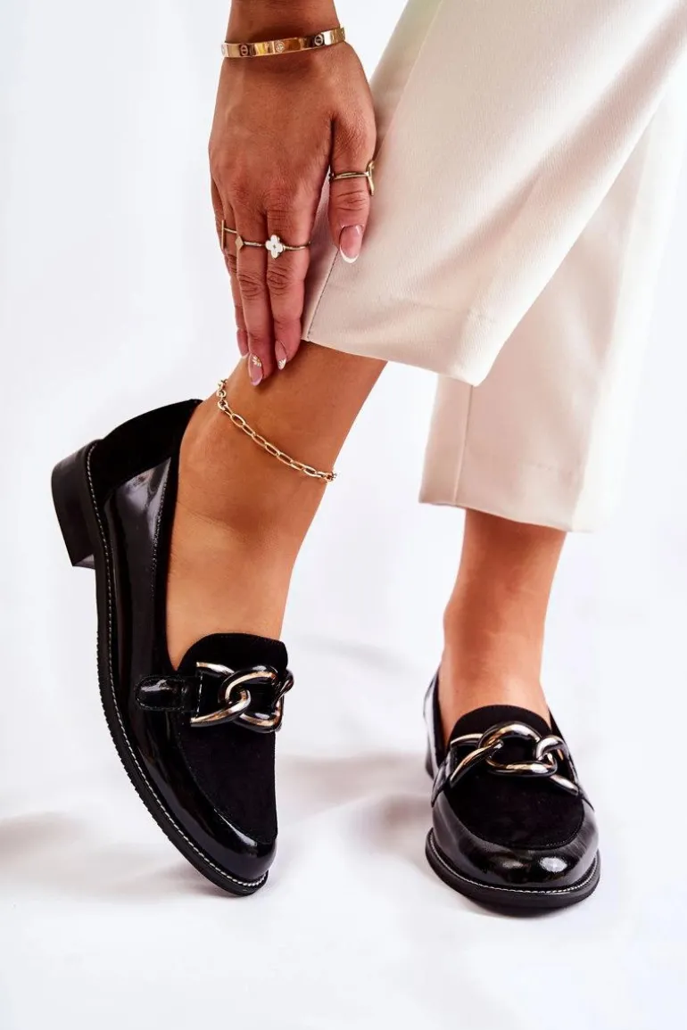 Eleganckie mokasyny od marki Laura Messi zostały wykonane z połączenia naturalnej skóry i naturalnego zamszu. Skórzana wkładka zapewni wysoki komfort użytkowania. Osadzone na płaskim obcasie z przeszywaną podeszwą. Buty te posiadają modny łańcuch na przodzie. Nosek zaokrąglony. Mokasyny posiadają usztywniany zapiętek. Koniecznie sprawdź całą naszą kolekcję mokasyn! Przy wyborze rozmiaru prosimy sugerować się tabelą rozmiarów.