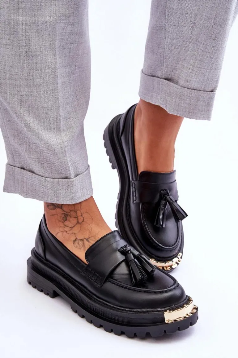 Klasyczne półbuty — mokasyny zostały wykonane z ekologicznej skóry. Na przodzie platformy posiadają ozdobne elementy, natomiast na środku obuwia zostały umieszczone frędzle. Mokasyny osadzono na płaskim obcasie i platformie. Model ten posiada delikatnie usztywniany zapiętek. Niezwykle stabilny fason, który powinien być Twój! Przy wyborze rozmiaru prosimy sugerować się tabelą rozmiarów.
