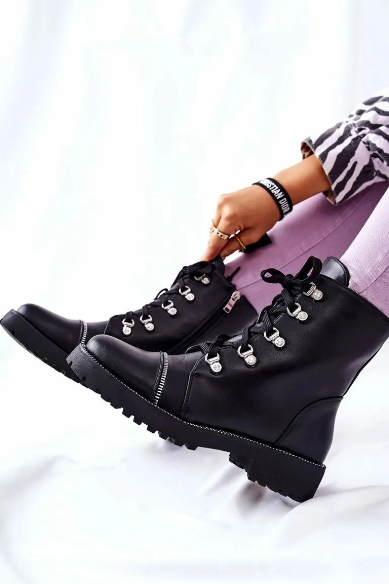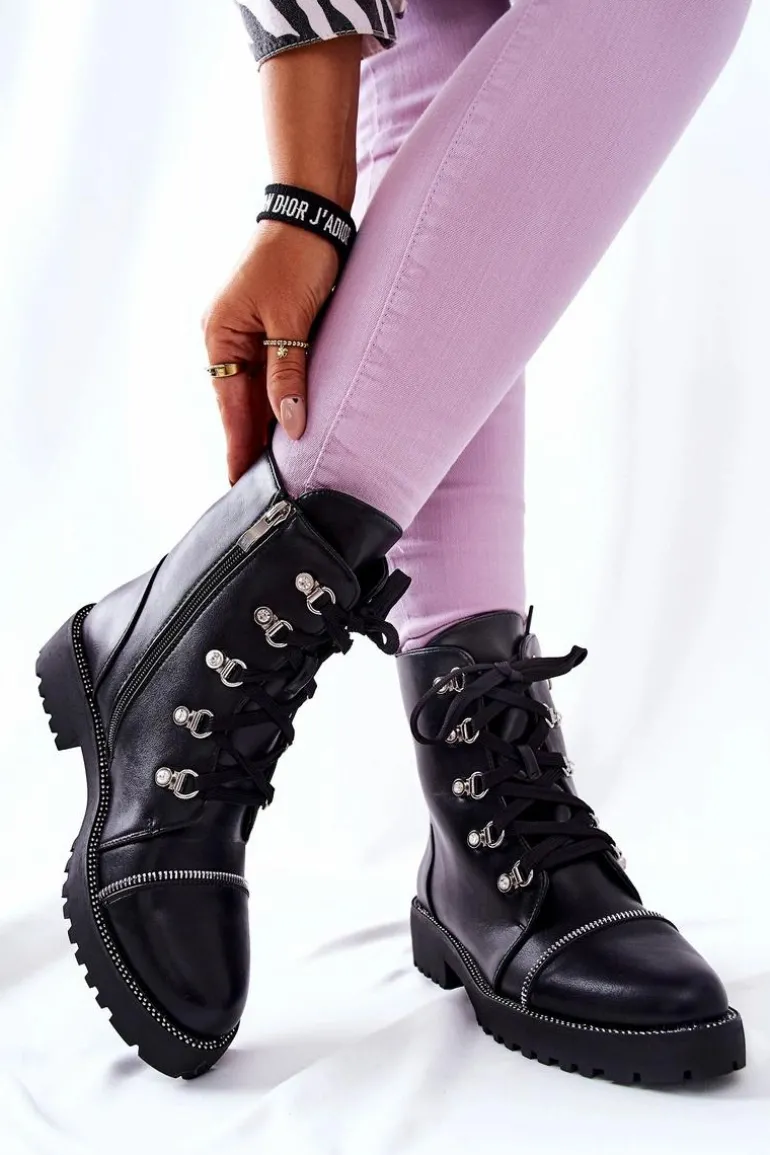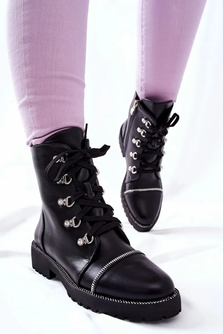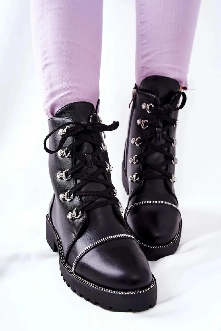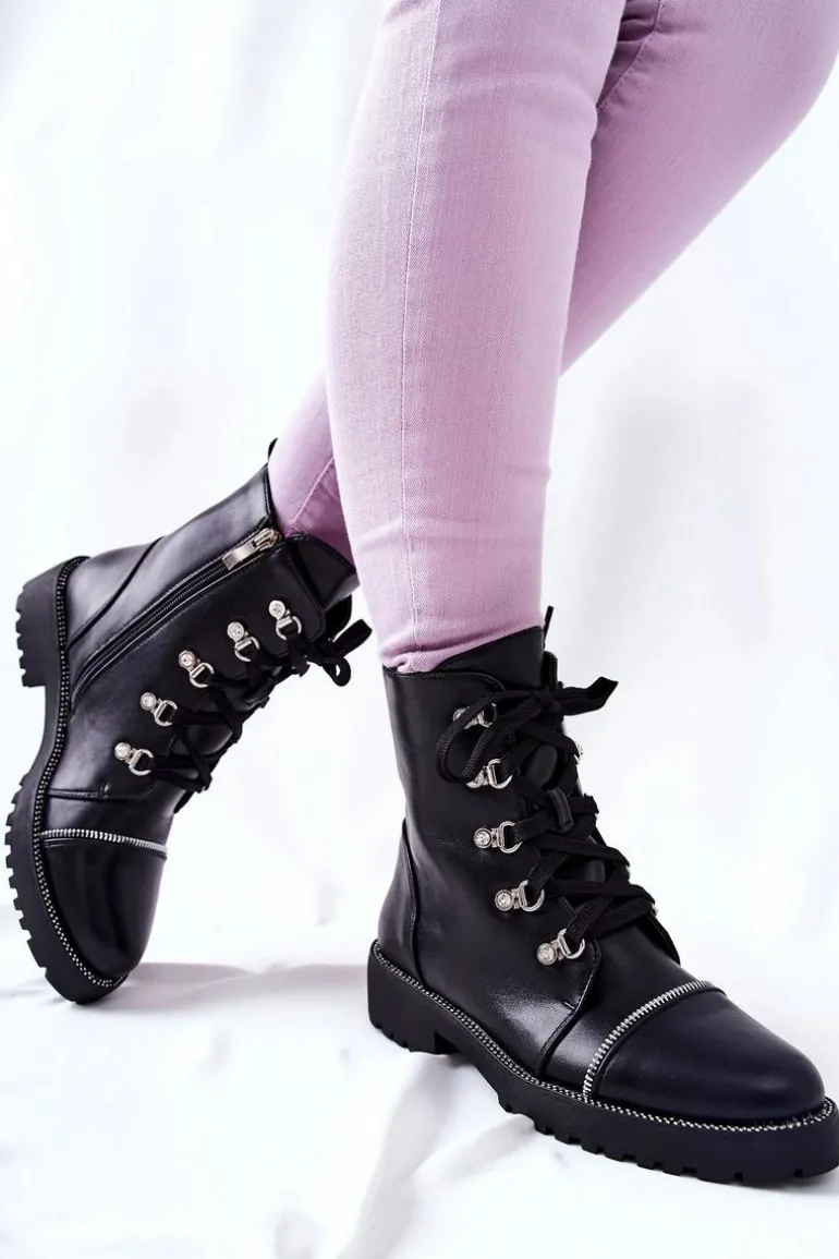 Klasyczne botki posiadają wiązanie oraz suwak ułatwiający zakładanie butów. Wykonane z eko skóry. Na przodzie widnieje część ozdobnego zamka błyskawicznego. Przy podeszwie są zdobione małymi cyrkoniami. Idealne na chłodne dni. Będą pasować do wielu stylizacji! Przy wyborze rozmiaru prosimy sugerować się tabelą rozmiarów.
