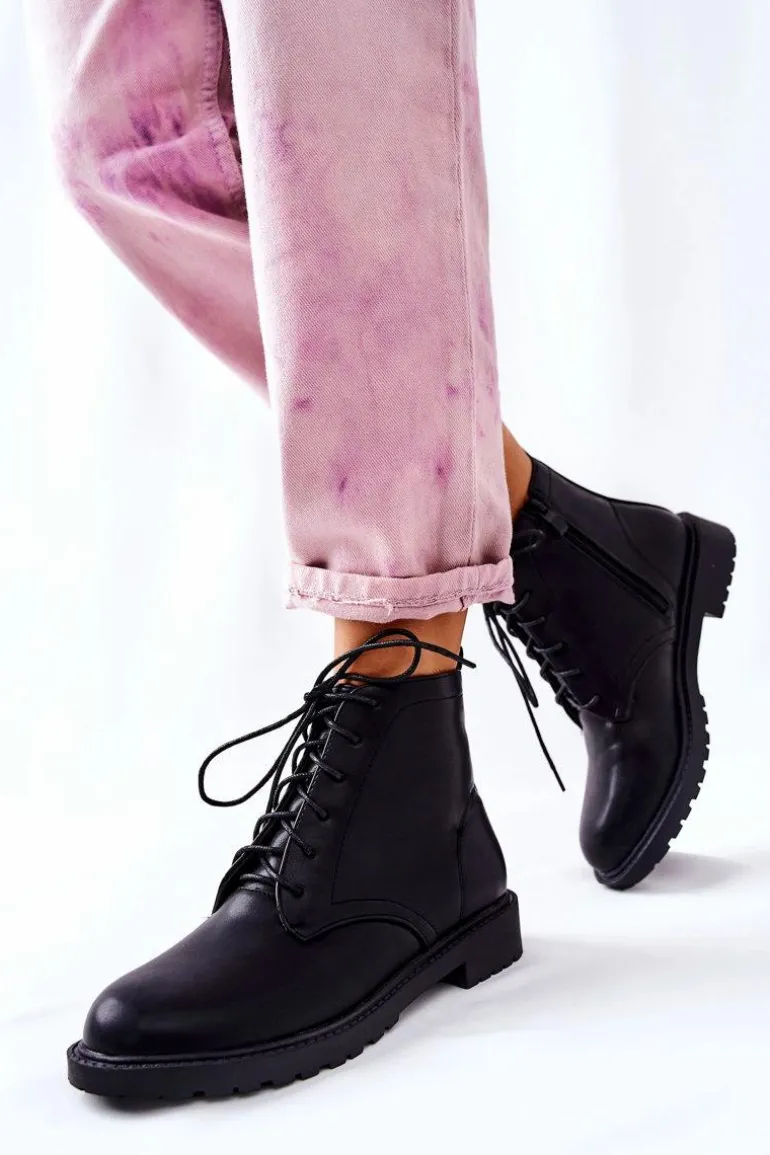 Klasyczne botki posiadają wiązanie oraz suwak ułatwiający zakładanie butów. Wykonane z eko skóry. Botki w środku posiadają na całości ocieplenie w postaci koca obuwniczego. Wiązanie w kolorze obuwia. Idealne na chłodne dni. Będą pasować do wielu stylizacji! Przy wyborze rozmiaru prosimy sugerować się tabelą rozmiarów.