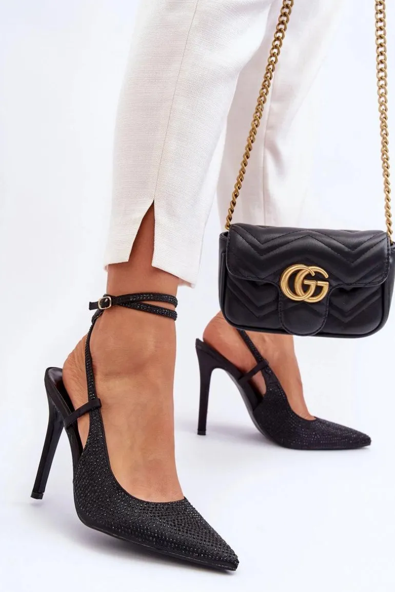 Szpilki powinny znaleźć się w szafie każdej kobiety. Model ten świetnie sprawdzi się zarówno do sukienek, jak i szerokich, eleganckich spodni. Szpilki z noskiem w szpic optycznie wysmuklą nogi. Model ten jest wsuwany i zapinany na sprzączkę osadzoną na pasku wokół łydki. Buty posiadają zdobienia w postaci małych cyrkonii. Przy wyborze rozmiaru prosimy sugerować się tabelą rozmiarów.