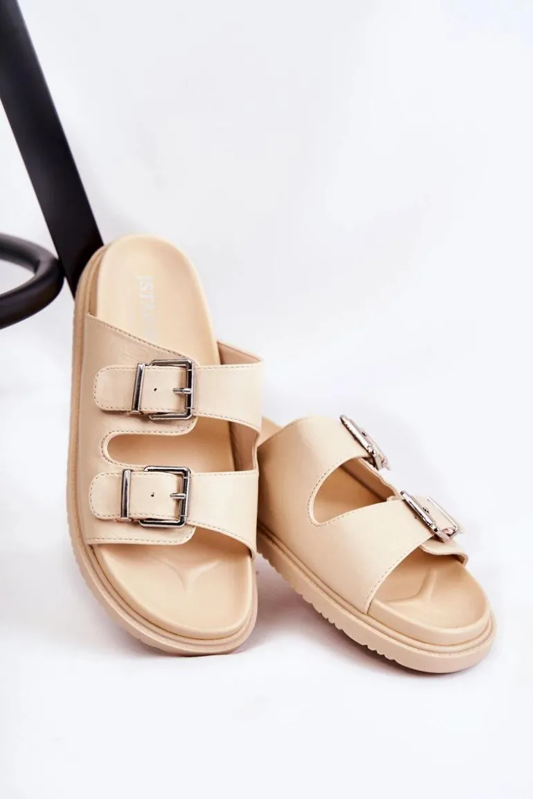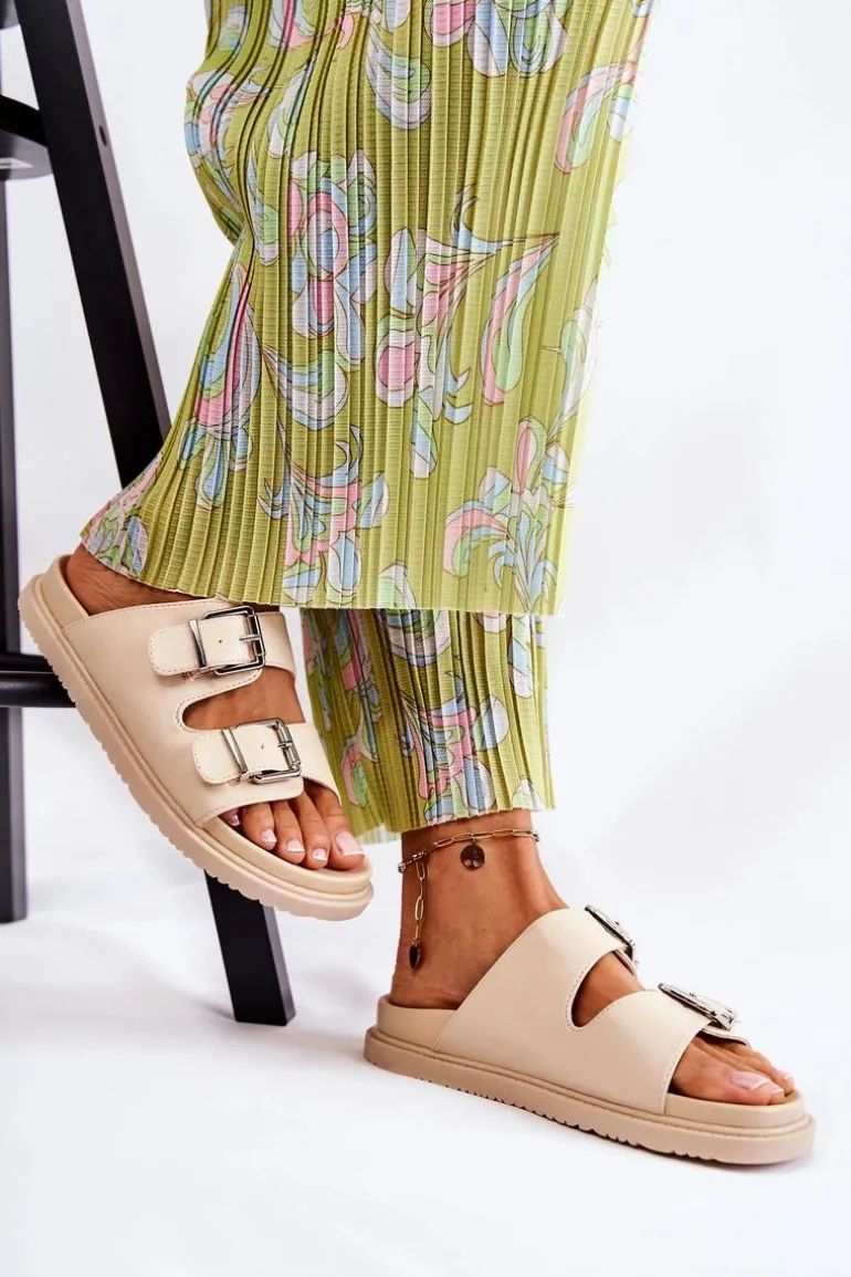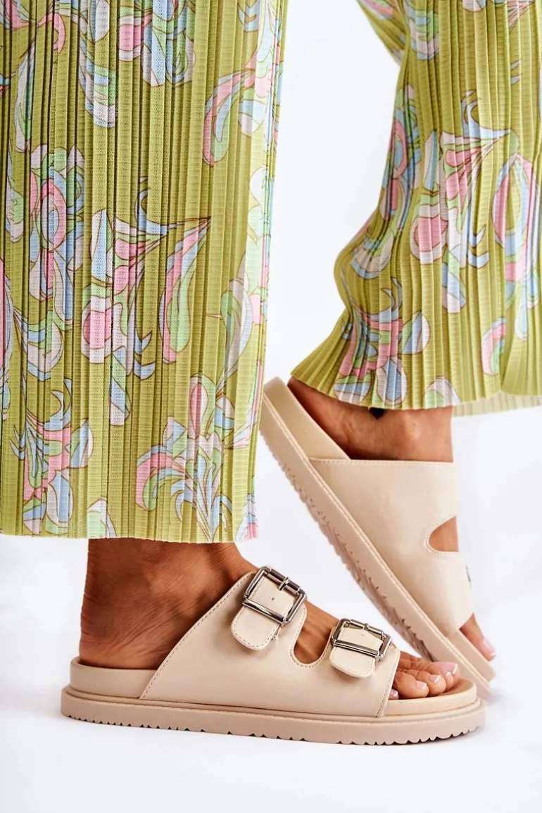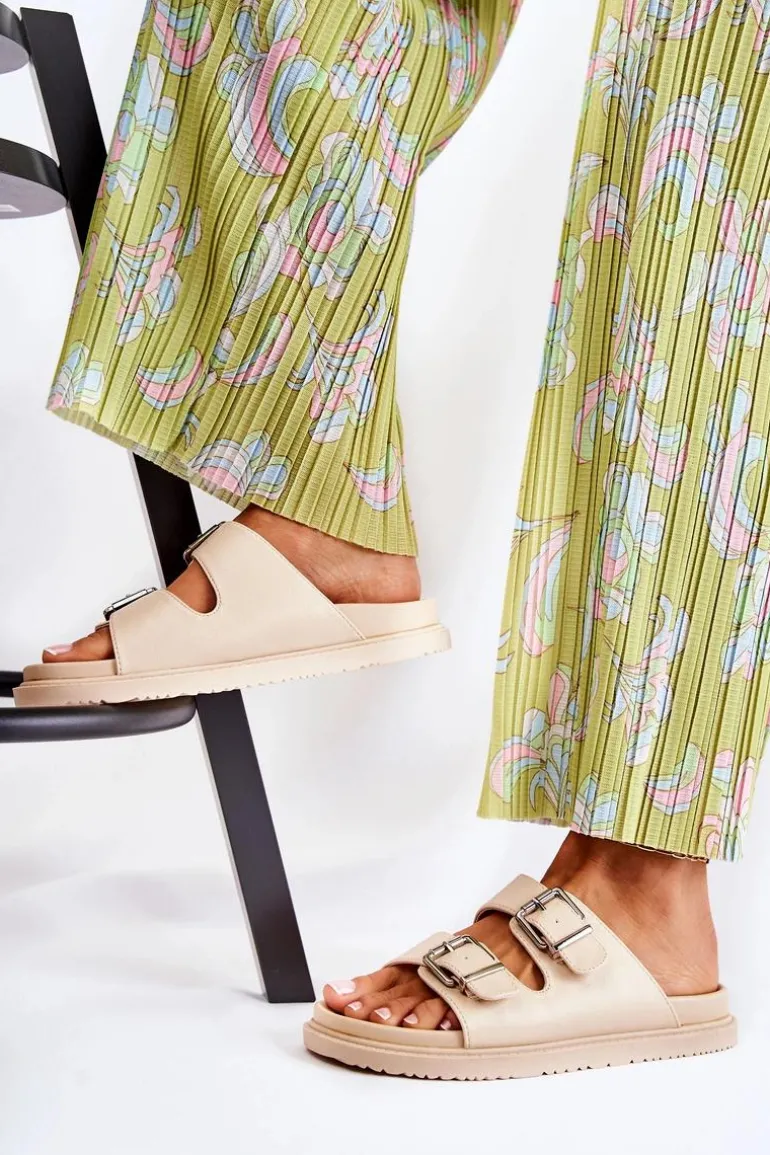 Klasyczne klapki wsuwane wykonane z eko skóry. Osadzone na płaskiej, grubszej podeszwie. Posiadają z przodu dwa regulowane paski ze sprzączką. Wygodna, profilowana wkładka z gumowego tworzywa. Idealne na co dzień! Model z odkrytym, zaokrąglonym noskiem. Świetne obuwie na lato! Przy wyborze rozmiaru prosimy sugerować się tabelą rozmiarów.