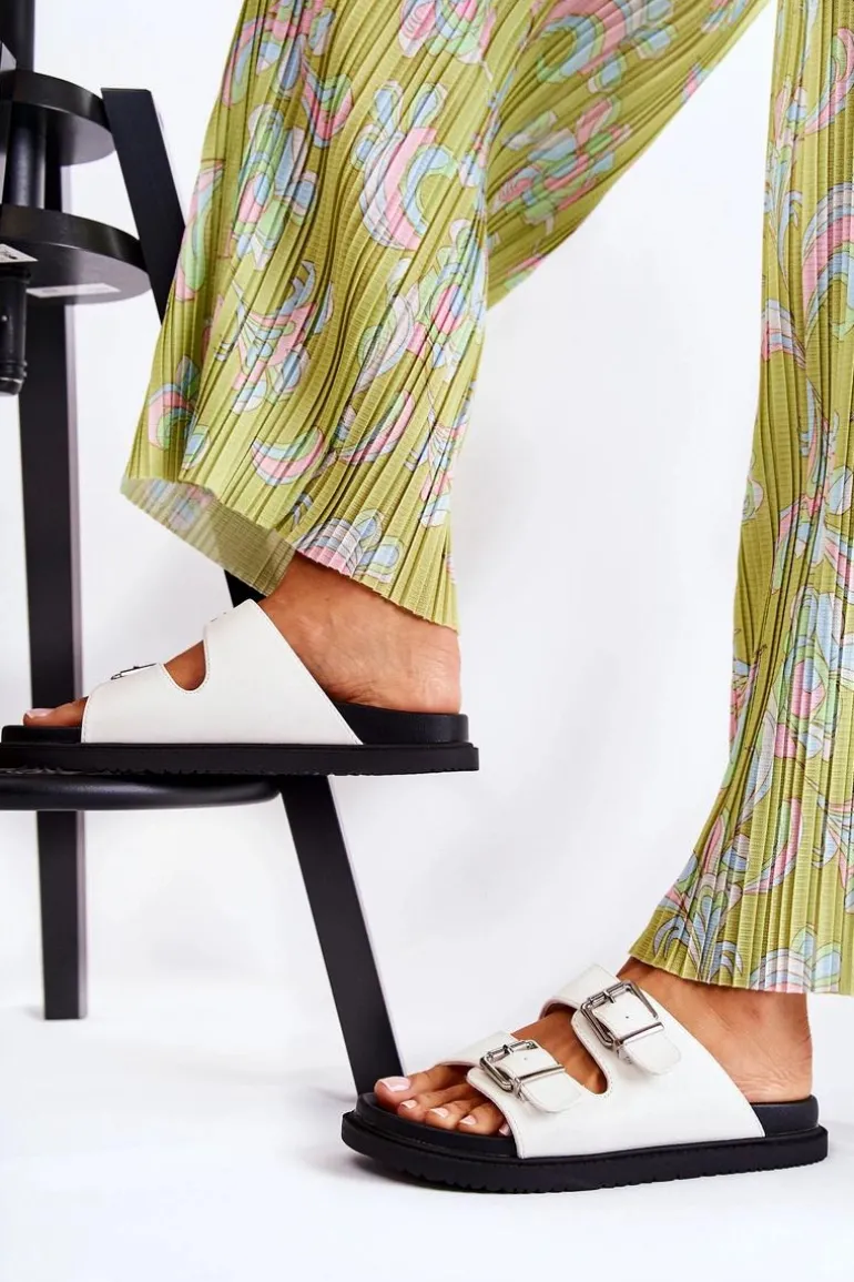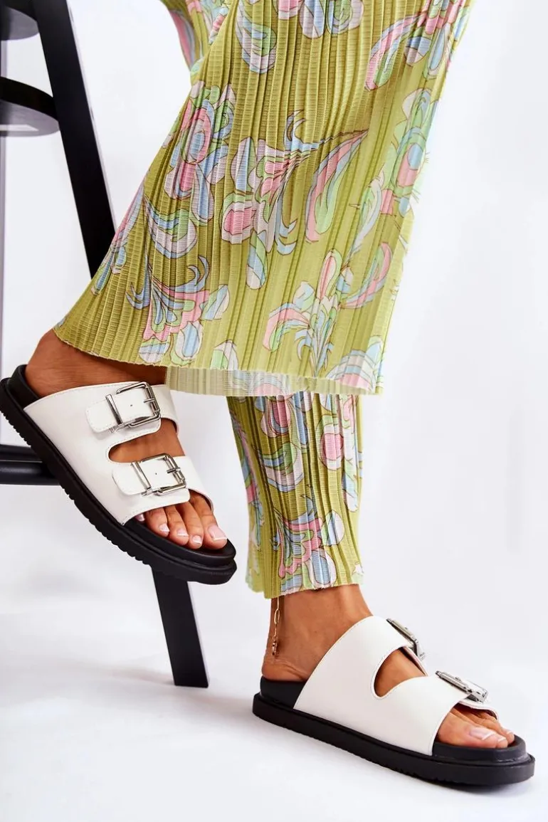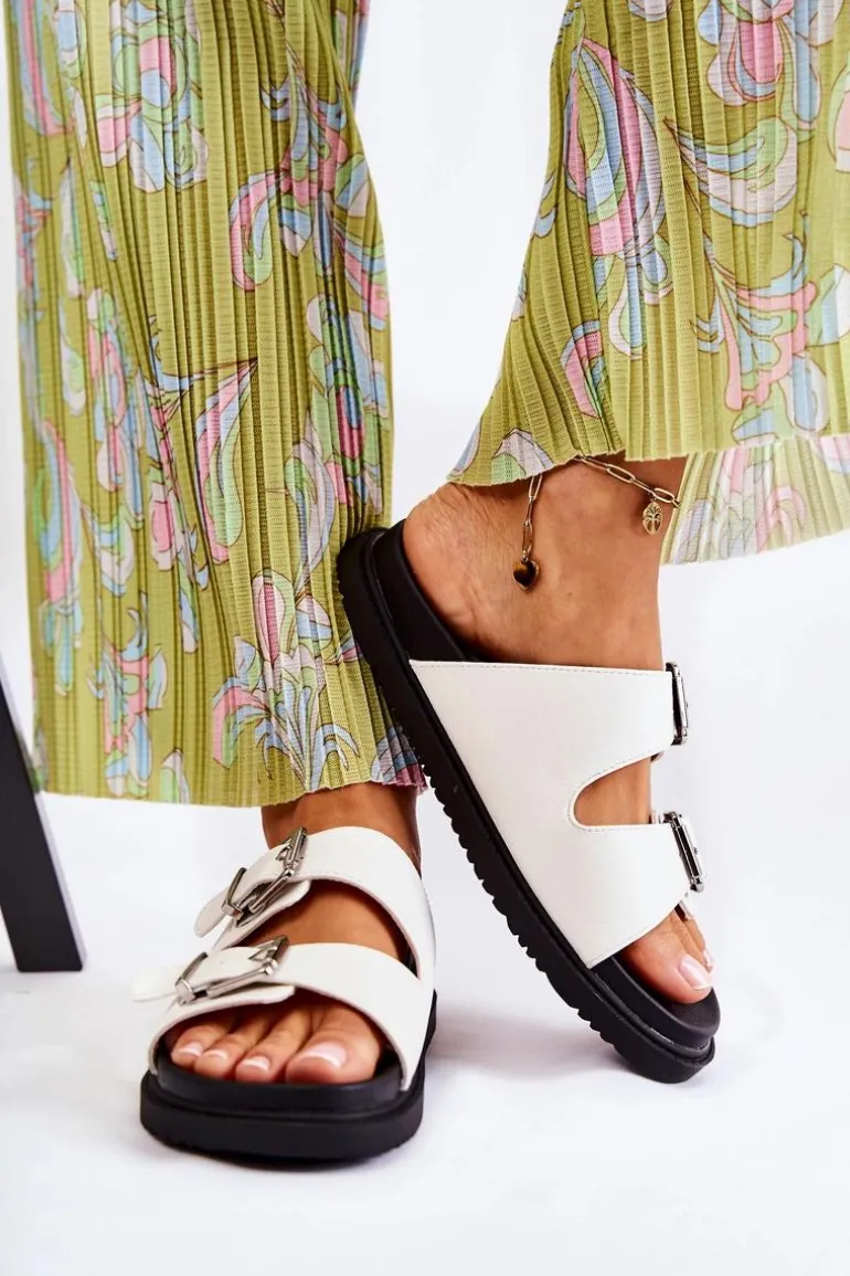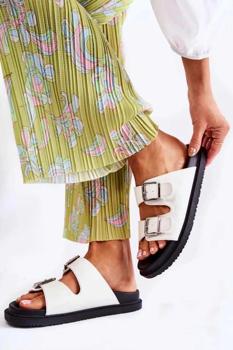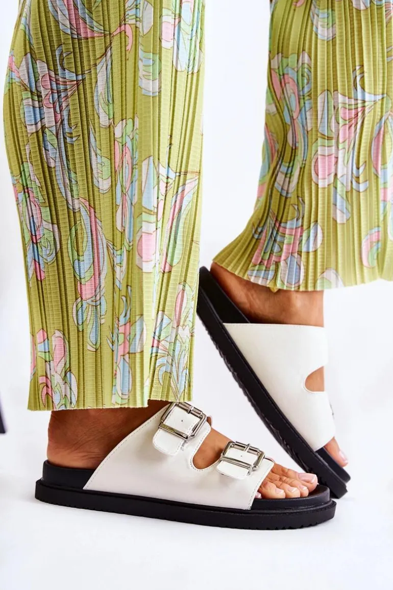 Klasyczne klapki wsuwane wykonane z eko skóry. Osadzone na płaskiej, grubszej podeszwie. Posiadają z przodu dwa regulowane paski ze sprzączką. Wygodna, profilowana wkładka z gumowego tworzywa. Idealne na co dzień! Model z odkrytym, zaokrąglonym noskiem. Świetne obuwie na lato! Przy wyborze rozmiaru prosimy sugerować się tabelą rozmiarów.