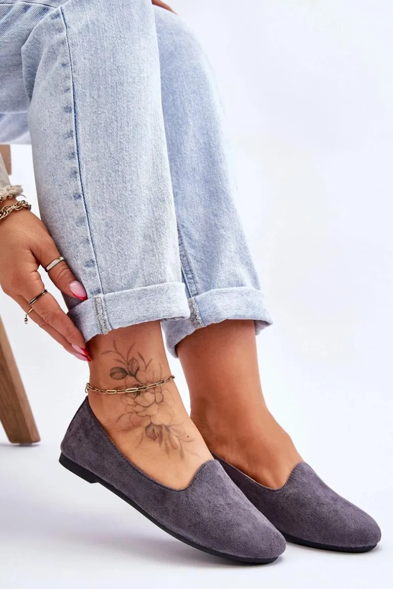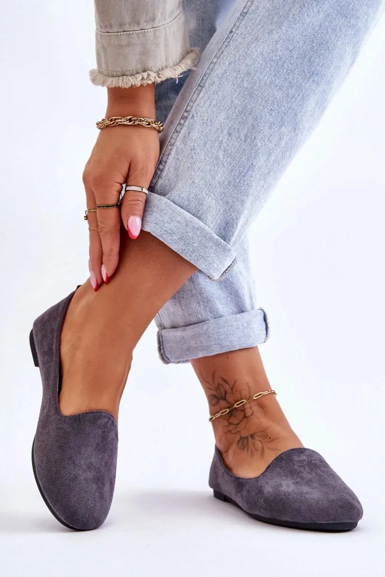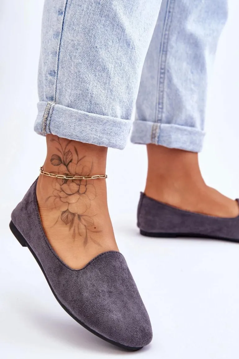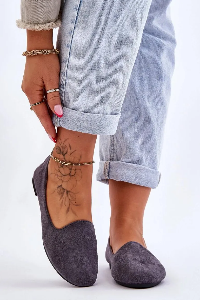 Klasyczne baleriny damskie zostały wykonane z eko zamszu. Posiadają zaokrąglony nosek. Osadzone na niewysokim, płaskim obcasie. Wkładka wykonana z eko skóry z delikatną perforacją jest bardzo miękka i wygodna podczas użytkowania. W tych balerinach poczujesz się niezwykle swobodnie. Koniecznie powinnaś mieć taki model w swojej garderobie! Przy wyborze rozmiaru prosimy sugerować się tabelą rozmiarów.