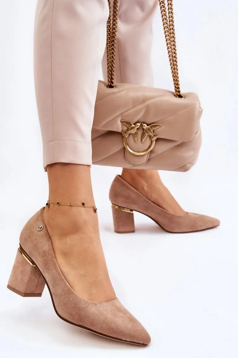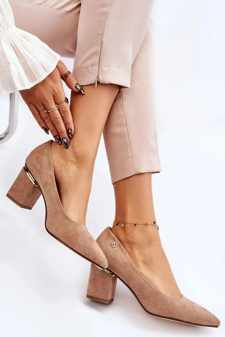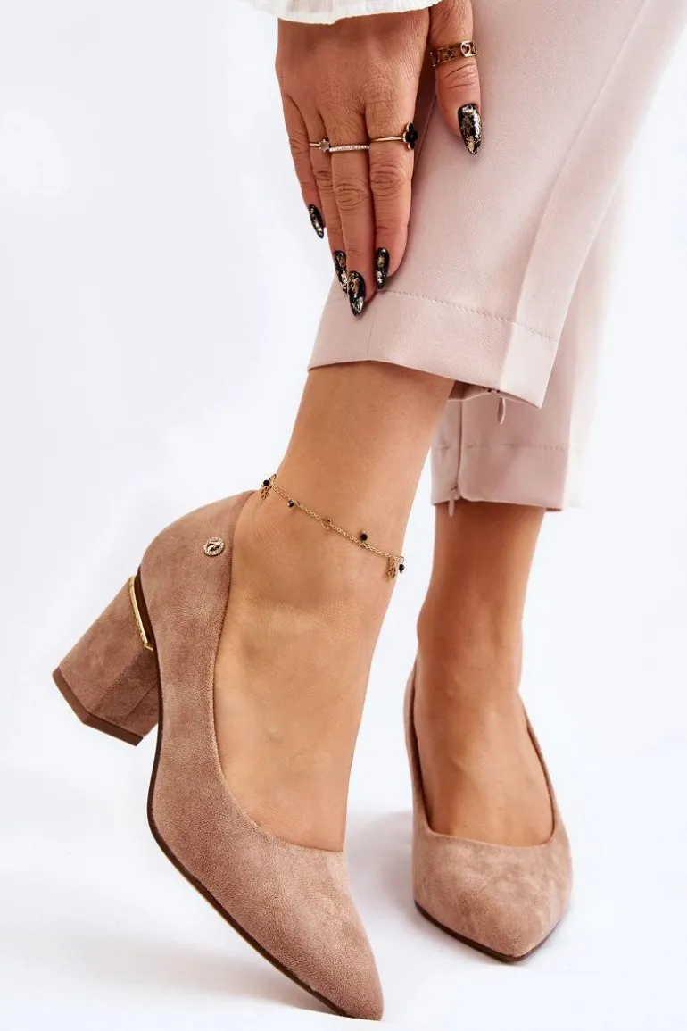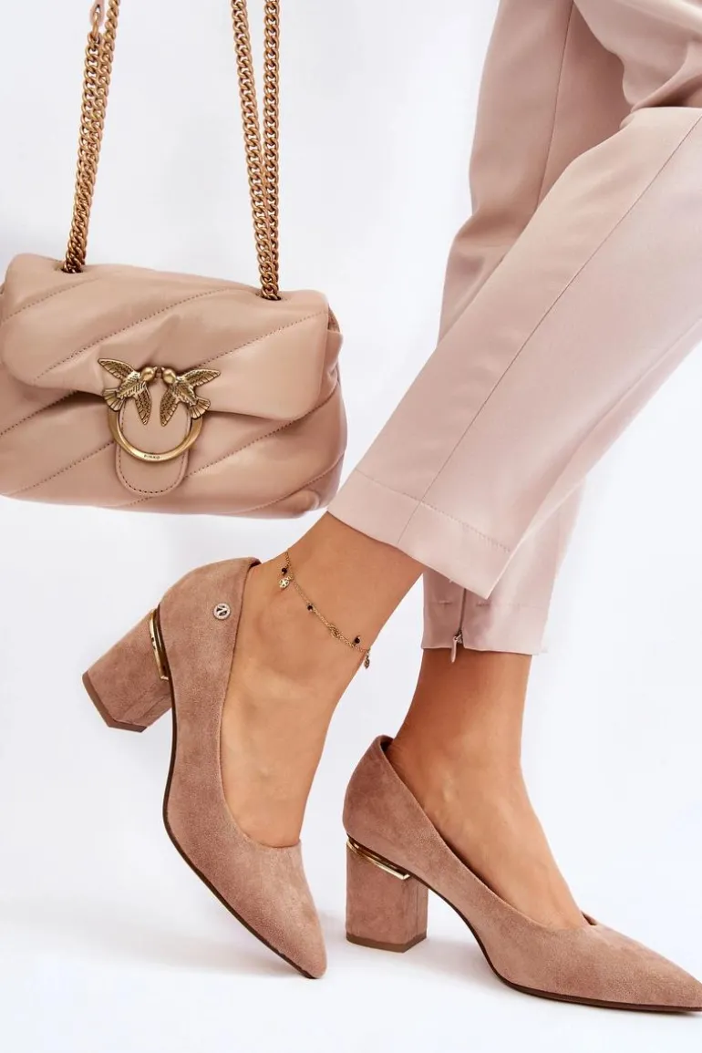Piękne czółenka osadzone na obcasie w postaci słupka. Wykonane z zamszowej eko skóry. Nosek w szpic wysmukli nogi. Idealny model do wielu stylizacji. Buty są niezwykle komfortowe w użytkowaniu, dzięki wkładce z naturalnej skóry. Obcas został ozdobiony lustrzanym elementem. Przy wyborze rozmiaru prosimy sugerować się tabelą rozmiarów.