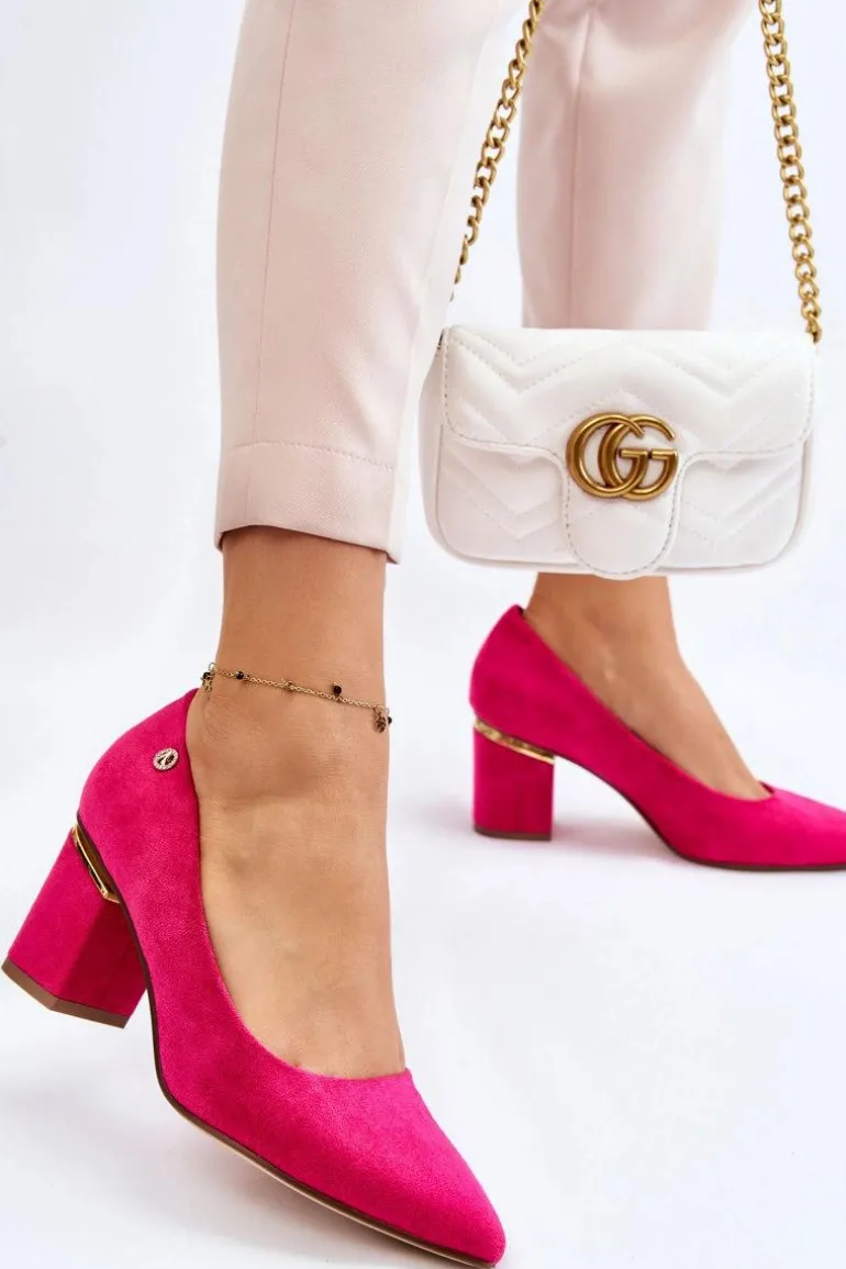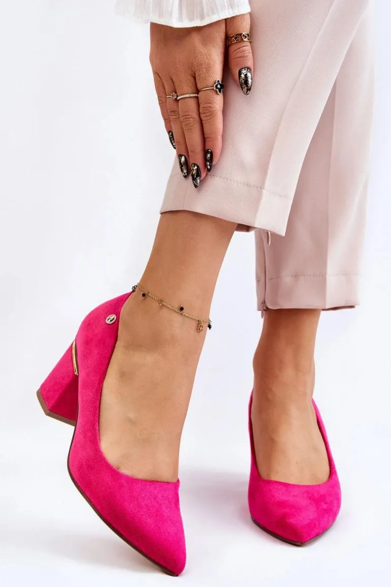 Piękne czółenka osadzone na obcasie w postaci słupka. Wykonane z zamszowej eko skóry. Nosek w szpic wysmukli nogi. Idealny model do wielu stylizacji. Buty są niezwykle komfortowe w użytkowaniu, dzięki wkładce z naturalnej skóry. Obcas został ozdobiony lustrzanym elementem. Przy wyborze rozmiaru prosimy sugerować się tabelą rozmiarów.