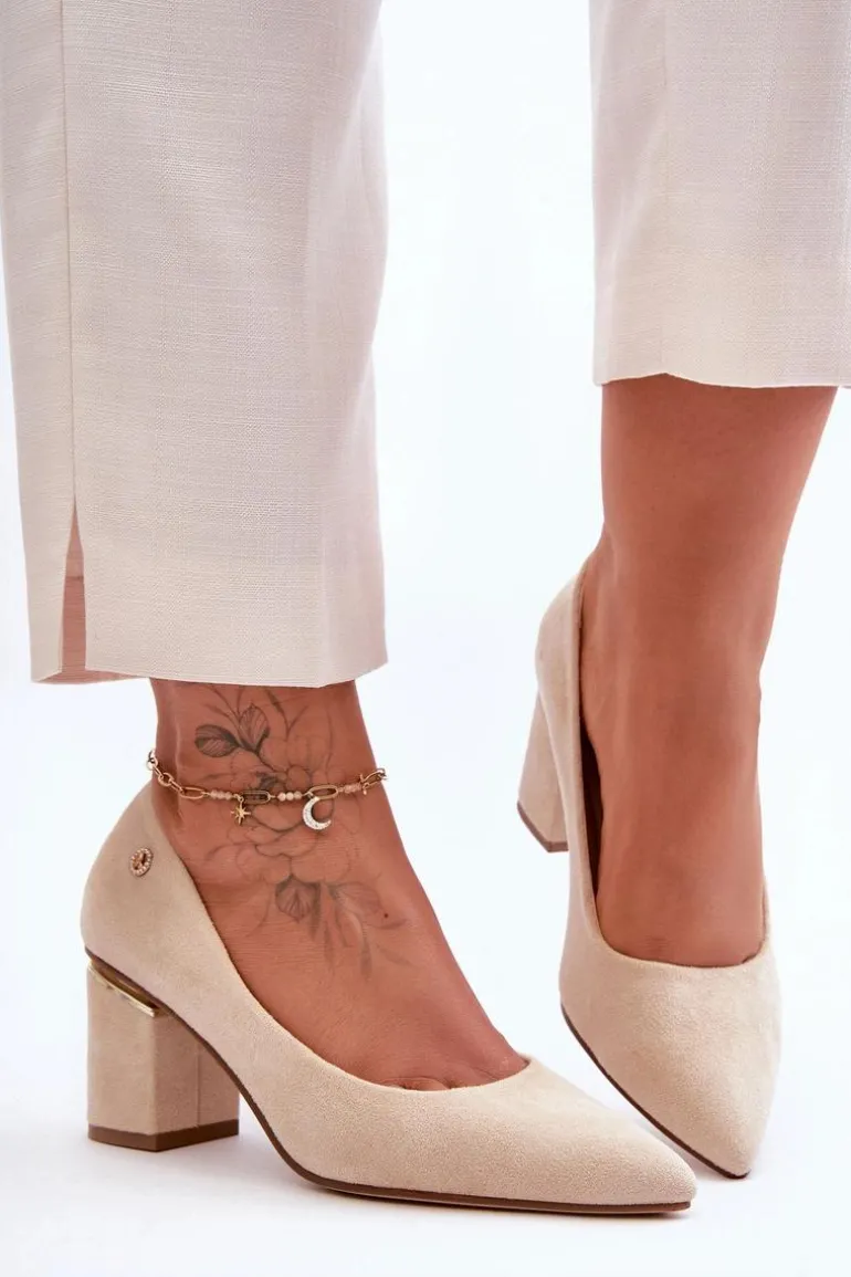 Klasyczne Zamszowe Czółenka Na Obcasie Z Ozdobą Jasnobeżowe Derren