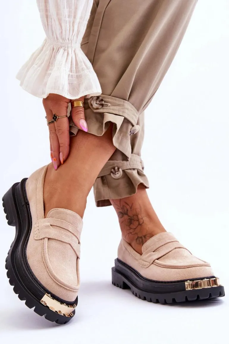 Klasyczne mokasyny zostały wykonane z ekologicznego zamszu. Na przodzie platformy posiadają ozdobne elementy. Osadzone na płaskim obcasie. Podeszwa z tworzywa sztucznego ze żłobieniami świetnie odizoluje od nierównego podłoża. Model wsuwany z usztywnianym zapiętkiem. Koniecznie powinnaś je mieć! Przy wyborze rozmiaru prosimy sugerować się tabelą rozmiarów.