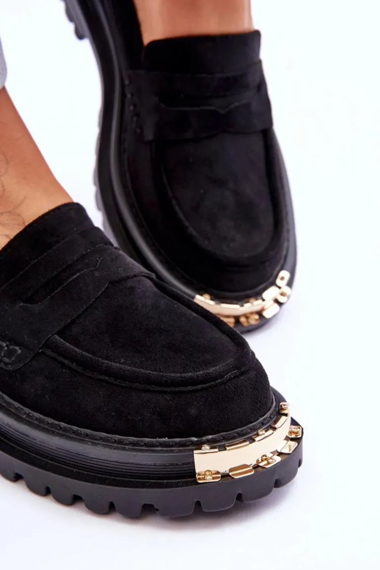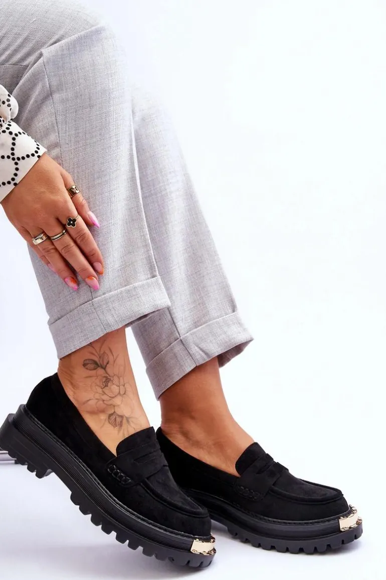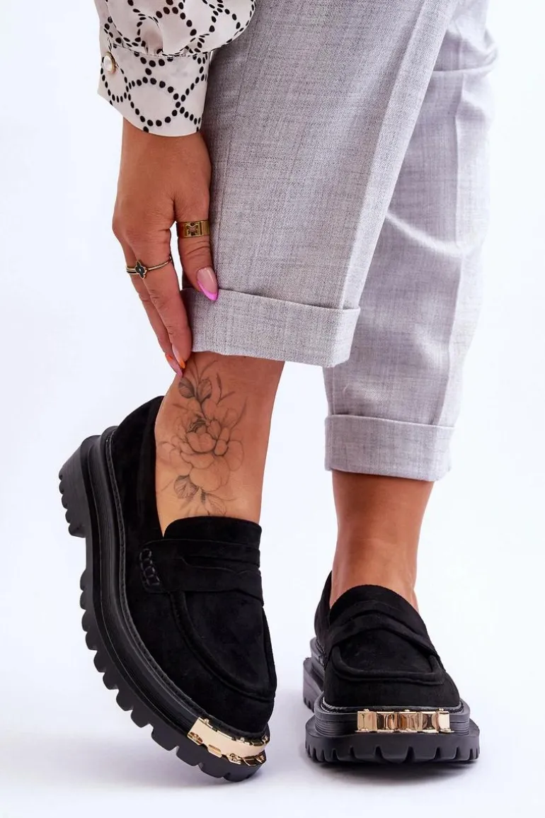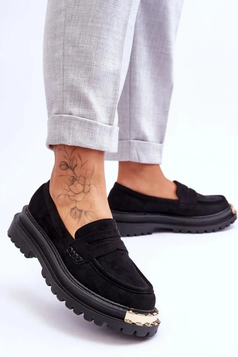Klasyczne mokasyny zostały wykonane z ekologicznego zamszu. Na przodzie platformy posiadają ozdobne elementy. Osadzone na płaskim obcasie. Podeszwa z tworzywa sztucznego ze żłobieniami świetnie odizoluje od nierównego podłoża. Model wsuwany z usztywnianym zapiętkiem. Koniecznie powinnaś je mieć! Przy wyborze rozmiaru prosimy sugerować się tabelą rozmiarów.