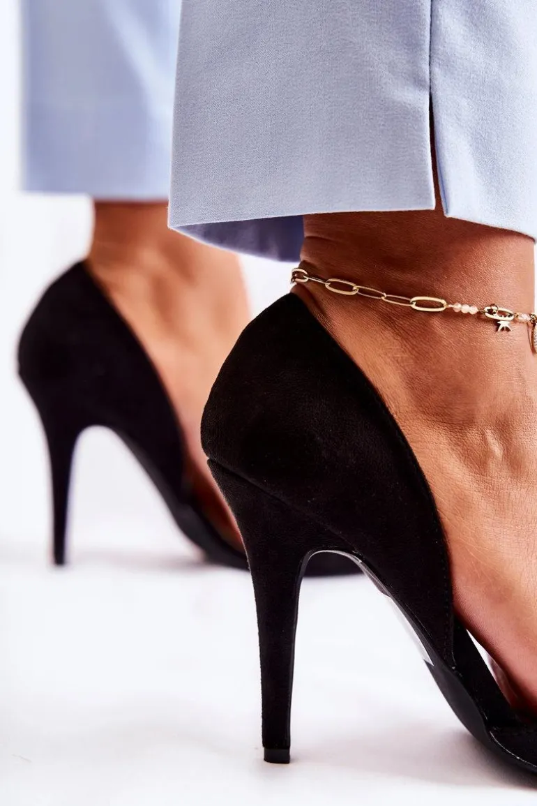 Klasyczne szpilki zostały wykonane z eko zamszu. Posiadają subtelne wycięcia po bokach cholewki. Zapiętek jest dodatkowo usztywniany z gumką. Buty zostały osadzone na obcasie w postaci szpilki. Nosek w szpic. Wygodna wkładka została wykonana z eko skóry. Model idealny na różnego rodzaju uroczystości. Koniecznie powinnaś je mieć w swojej garderobie! Przy wyborze rozmiaru prosimy sugerować się tabelą rozmiarów.