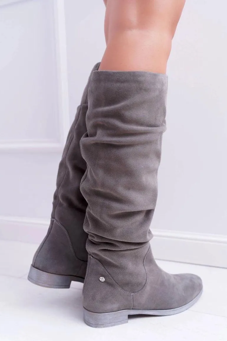 Wspaniałe klasyczne kozaki wykonane z wysokiej jakości skóry zamszowej. Wspaniały wzór z marszczoną cholewką, na płaskim obcasie. Idealne do wielu stylizacji. Produkt Polski, w 100% ręcznie wykonany. Dbałość o każdy detal. Rozmiarówka kozaków jest większa niż standardowa, zalecamy wybór mniejszego rozmiaru.