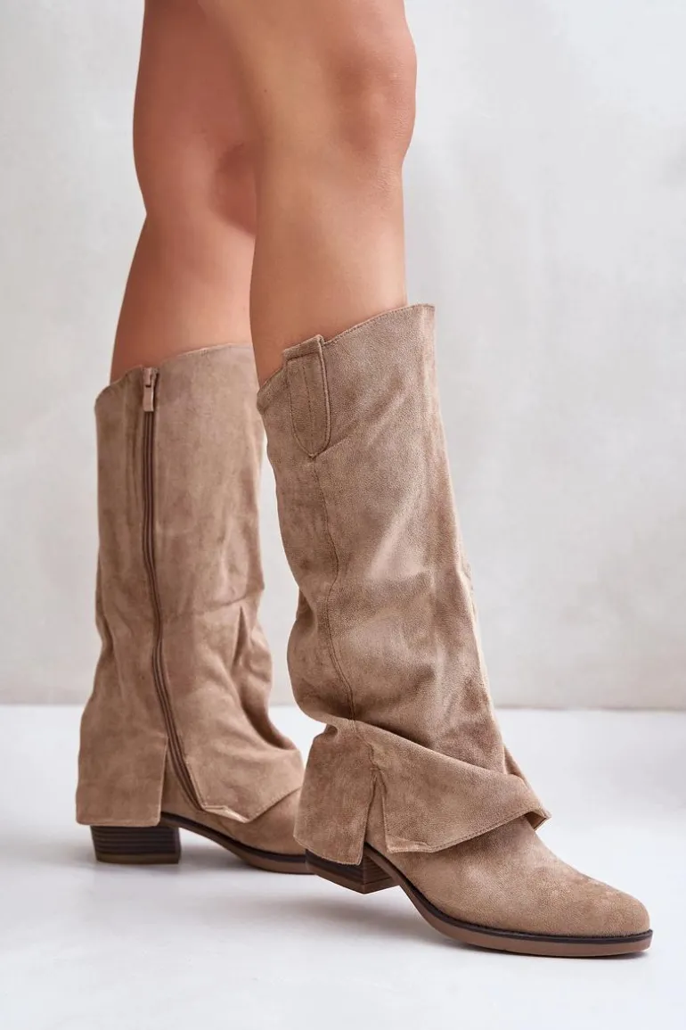 Modne kozaki damskie wykonane z eko zamszu. Osadzone na niskim, stabilnym obcasie. Noski w migdał. Środek ocieplany miłym w dotyku kocem obuwniczym. Głównym atutem tego modelu jest wywinięta cholewka, która lekko zachodzi na obcas. Zapinane na suwak. Idealne do sukienek czy spódnic! Przy wyborze rozmiaru prosimy sugerować się tabelą rozmiarów.