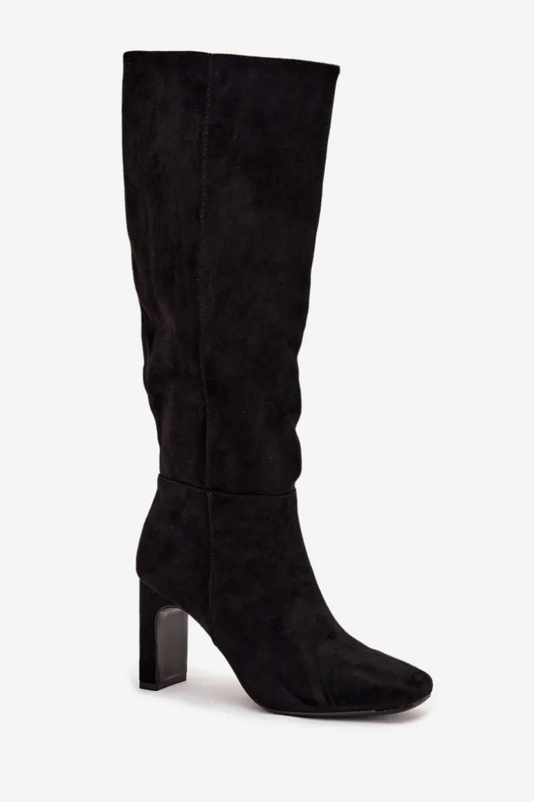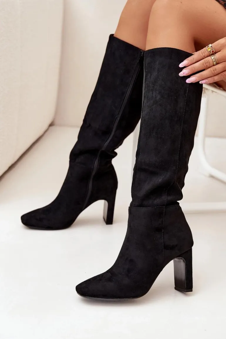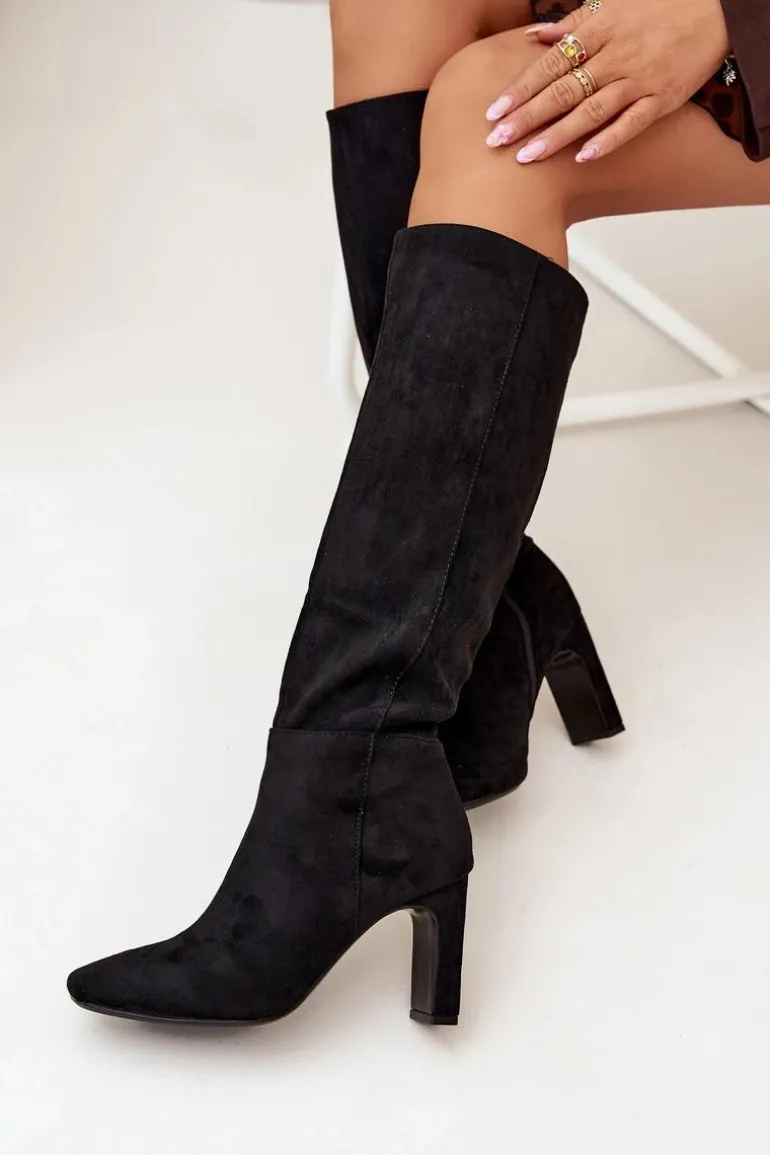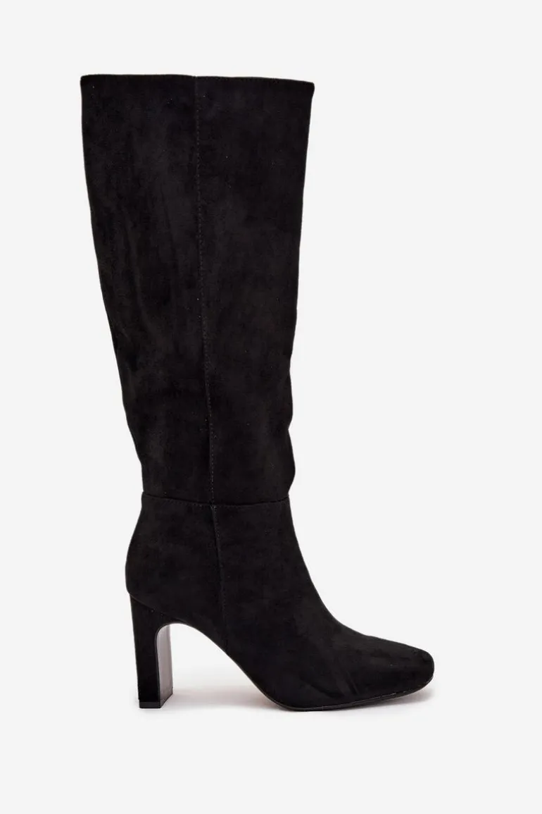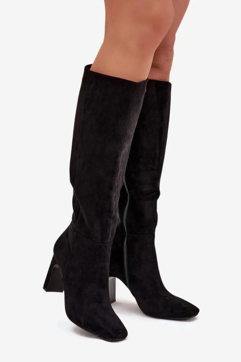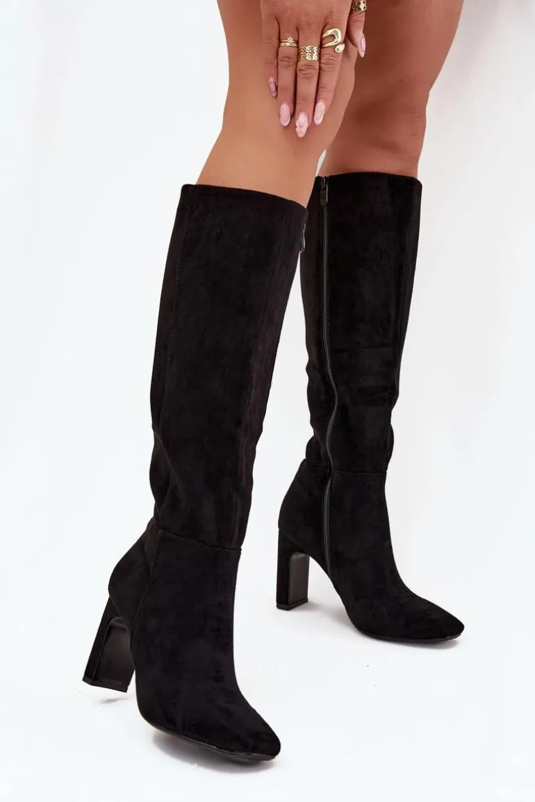 Kozaki damskie z eko zamszu, osadzone na obcasie w formie słupka, to elegancka propozycja na zimowe dni. Noski w kwadratowym kształcie dodają im nowoczesnego charakteru, a ocieplenie kocem obuwniczym zapewnia ciepło. Zapinane na zamek, cholewka sięgająca do kolana sprawia, że te kozaki są idealne do eleganckich i casualowych stylizacji, łącząc wygodę z modnym wyglądem. Przy wyborze rozmiaru prosimy sugerować się tabelą rozmiarów.