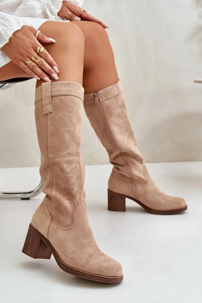Kozaki Damskie Na Słupku Przed Kolano Beżowe Erisorae