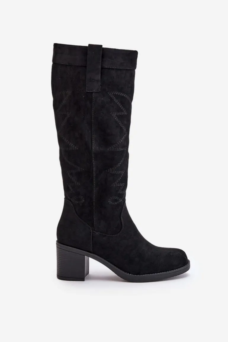 Damskie kozaki przed kolano wykonane z eko zamszu. Osadzone na obcasie w postaci niskiego słupka. Noski zaokrąglone. Cholewka ozdobiona przeszyciami. Model zapinany na zamek. Świetne do jesiennych stylizacji! Przy wyborze rozmiaru prosimy sugerować się tabelą rozmiarów.