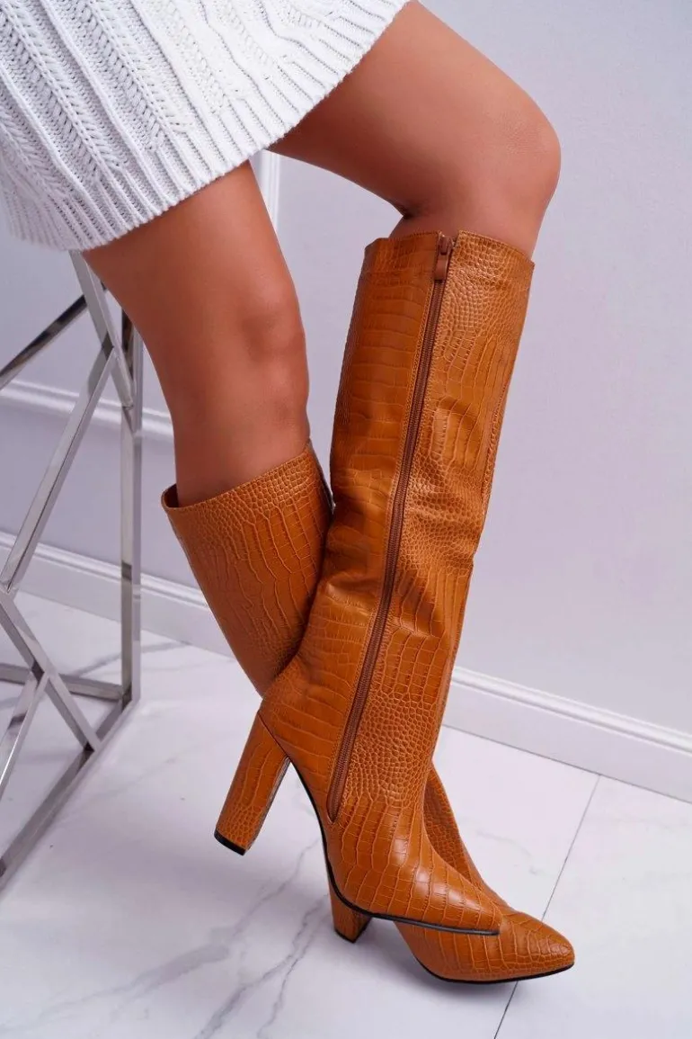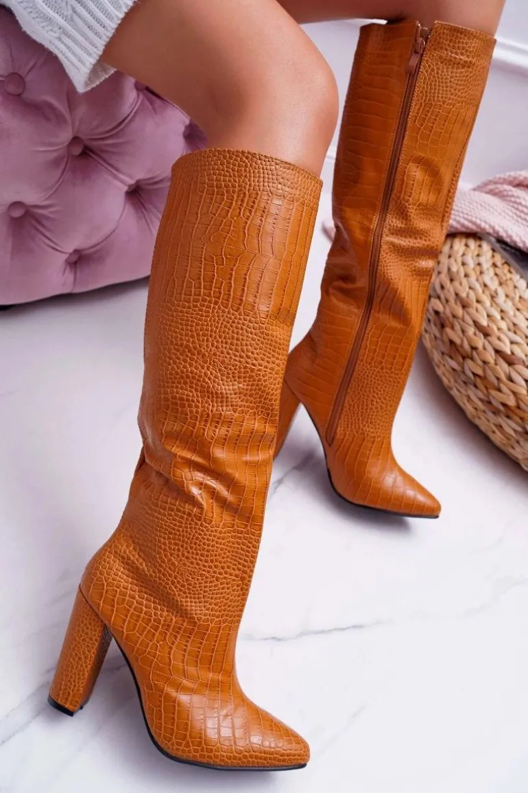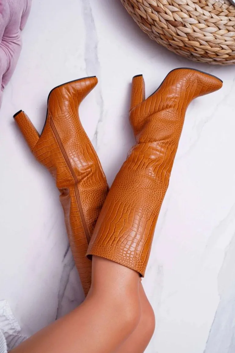 Kozaki Damskie Na Słupku Skóra Węża Camel Aduan