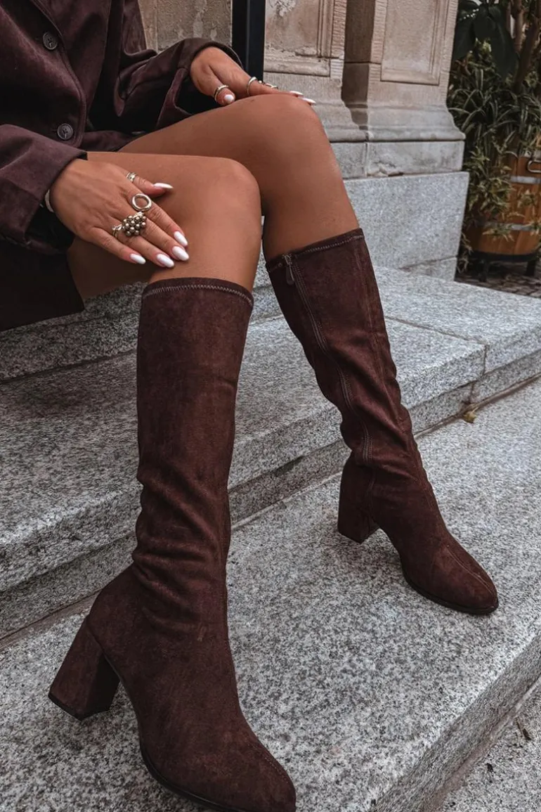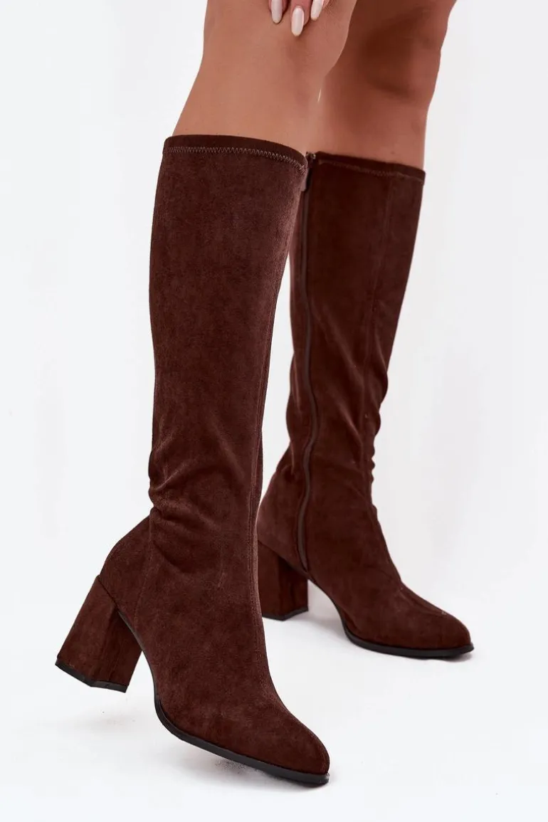 Kozaki damskie wykonane z eko zamszu to elegancka propozycja, która doskonale uzupełni jesienno-zimowe stylizacje. Model osadzony został na stabilnym obcasie typu słupek, który subtelnie wysmukla sylwetkę i dodaje jej kobiecego charakteru. Zapięcie na zamek ułatwia zakładanie i zdejmowanie butów. Prosty fason z delikatnym przeszyciem biegnącym wzdłuż cholewki z przodu i z tyłu nadaje całości klasy oraz optycznie wydłuża nogi. To uniwersalne kozaki, które świetnie prezentują się w połączeniu z sukienkami, spódnicami czy dopasowanymi spodniami, podkreślając elegancję i styl. Przy wyborze rozmiaru prosimy sugerować się tabelą rozmiarów.