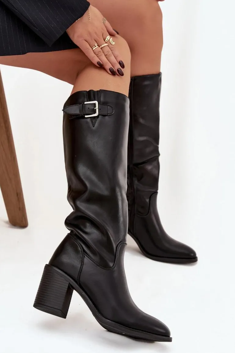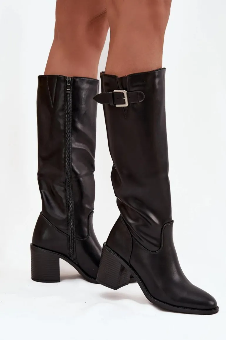 Kozaki damskie wykonane z eko skóry to elegancka i praktyczna propozycja na chłodniejsze dni. Model osadzony na stabilnym obcasie typu słupek zapewnia wygodę i pewność kroku, a zaokrąglone noski nadają całości klasycznego charakteru. Buty zapinane są na zamek, co ułatwia ich zakładanie i zdejmowanie. Na górze cholewki znajduje się ozdobna klamra, która dodaje im stylowego akcentu. Wnętrze ocieplone pianką pokrytą materiałem gwarantuje komfort i ciepło. To uniwersalne kozaki, które doskonale sprawdzą się zarówno w codziennych, jak i eleganckich stylizacjach. Przy wyborze rozmiaru prosimy sugerować się tabelą rozmiarów.