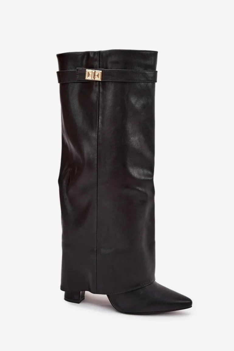 Kozaki damskie z eko skóry, sięgające przed kolano, to elegancka propozycja na chłodniejsze dni. Głównym atutem tego modelu jest wywinięta cholewka ozdobiona paseczkiem ze złotym detalem, który nadaje im wyjątkowego charakteru. Noski w szpic optycznie wysmuklają nogi, a obcas w formie słupka zapewnia stabilność i komfort. Zapinane na zamek, te kozaki będą doskonałym wyborem na eleganckie wyjścia oraz codzienne stylizacje. Przy wyborze rozmiaru prosimy sugerować się tabelą rozmiarów.